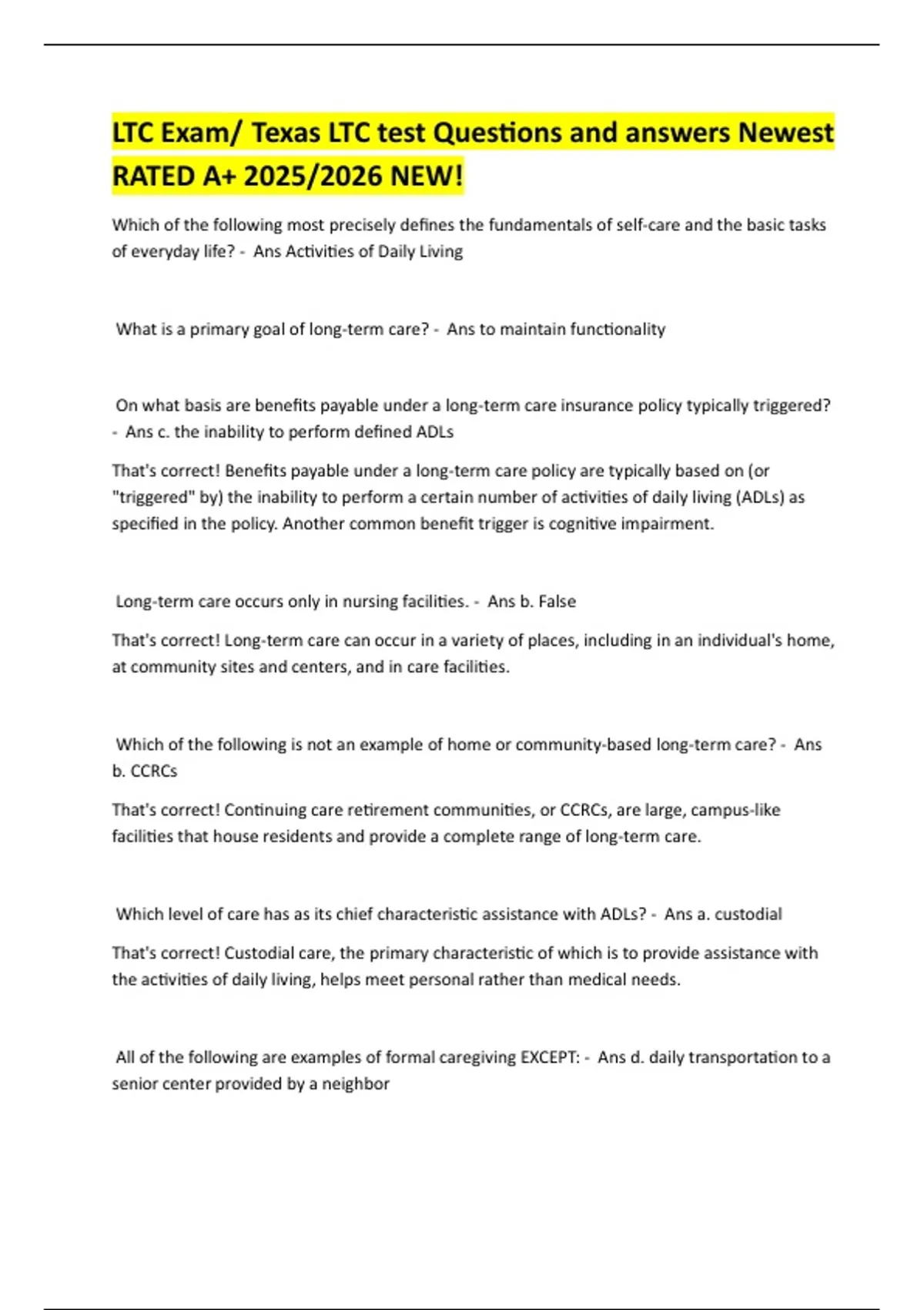 Which level of care has as its chief characteris c assistance with ADLs? - Ans a. custodial