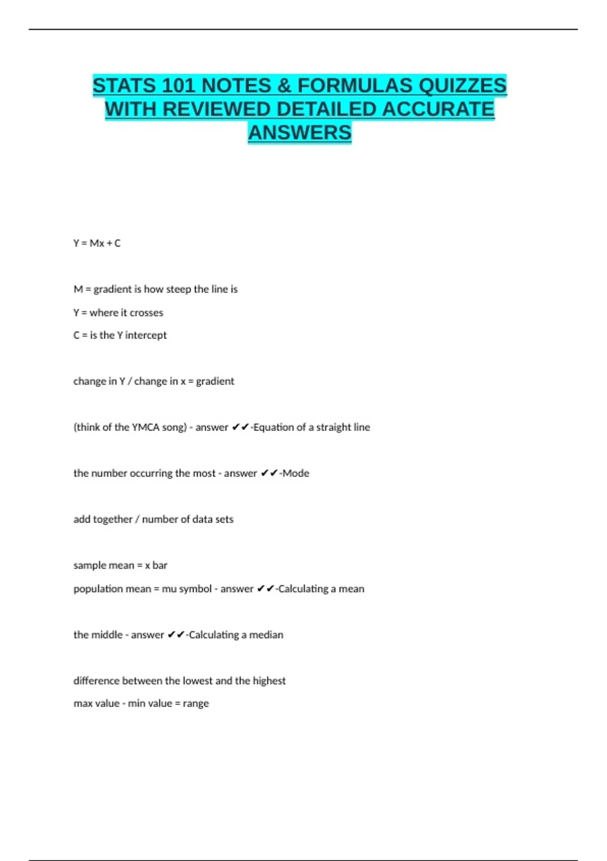 STATS 101 NOTES & FORMULAS QUIZZES WITH REVIEWED DETAILED ACCURATE ANSWERS.