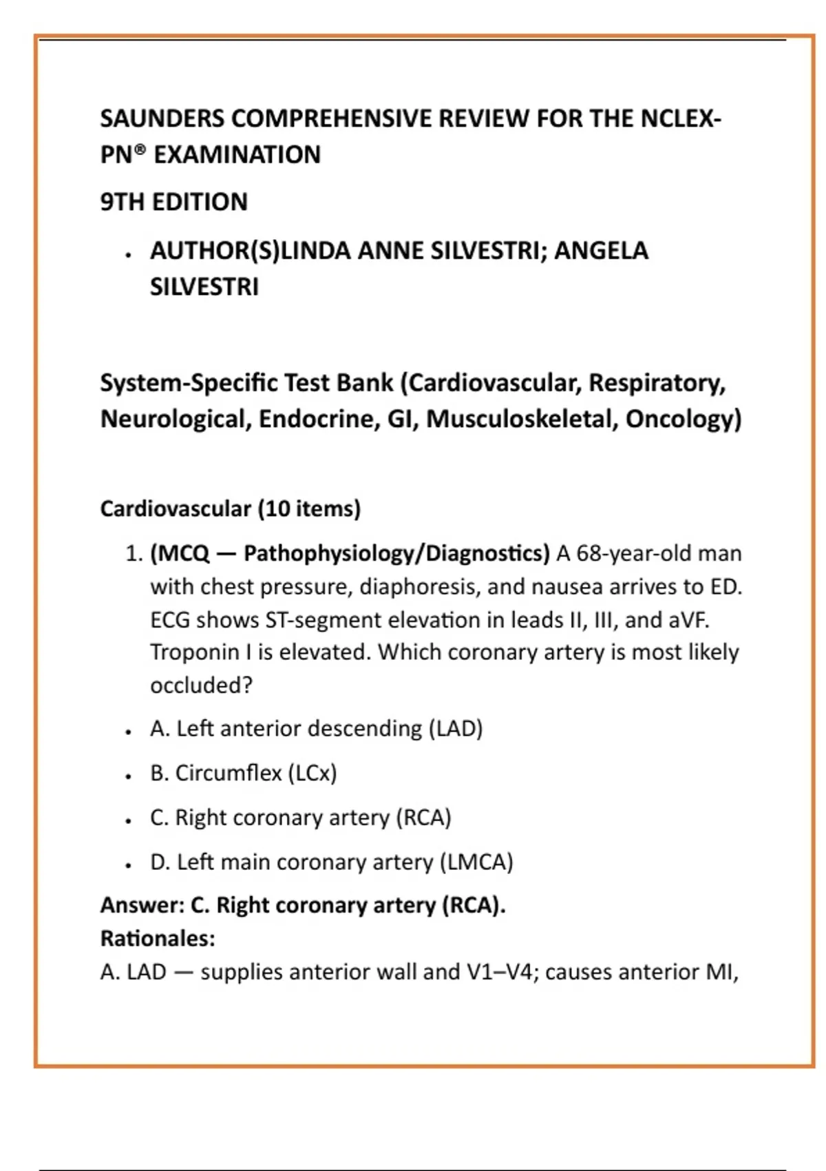 Saunders NCLEX-RN 2025 Test Bank | 700+ NGN Questions with Rationales | Cardiovascular to Oncology Systems Meta Description (150–160 characters) Master the NCLEX-RN 2025! 700+ Saunders-style NGN questions with rationales by system. Build confidence & clinical judgment mastery. SEO Keywords (10–12) NCLEX-RN Test Bank, Saunders Review, NCLEX 2025, NGN questions, nursing exam prep, clinical judgment model, nursing test bank, NCLEX rationales, RN review questions, nursing systems test bank, NCLEX Saunders practice Social Hashtags (10) #NCLEX2025 #NursingStudents #SaundersReview #NCLEXRN #NursingEducation #TestBank #NextGenNCLEX #NurseLife #StudyNursing #RNPrep Long-Form Product Description (400–600 words)