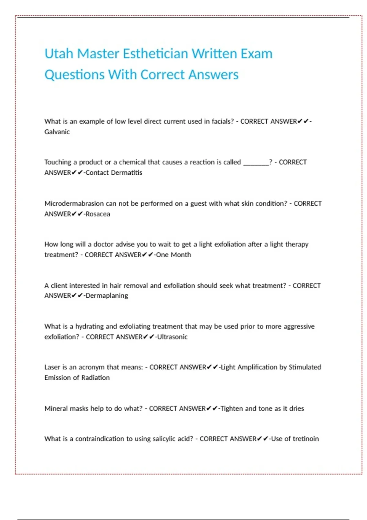 Utah Master Esthetician Written Exam Questions With Correct Answers