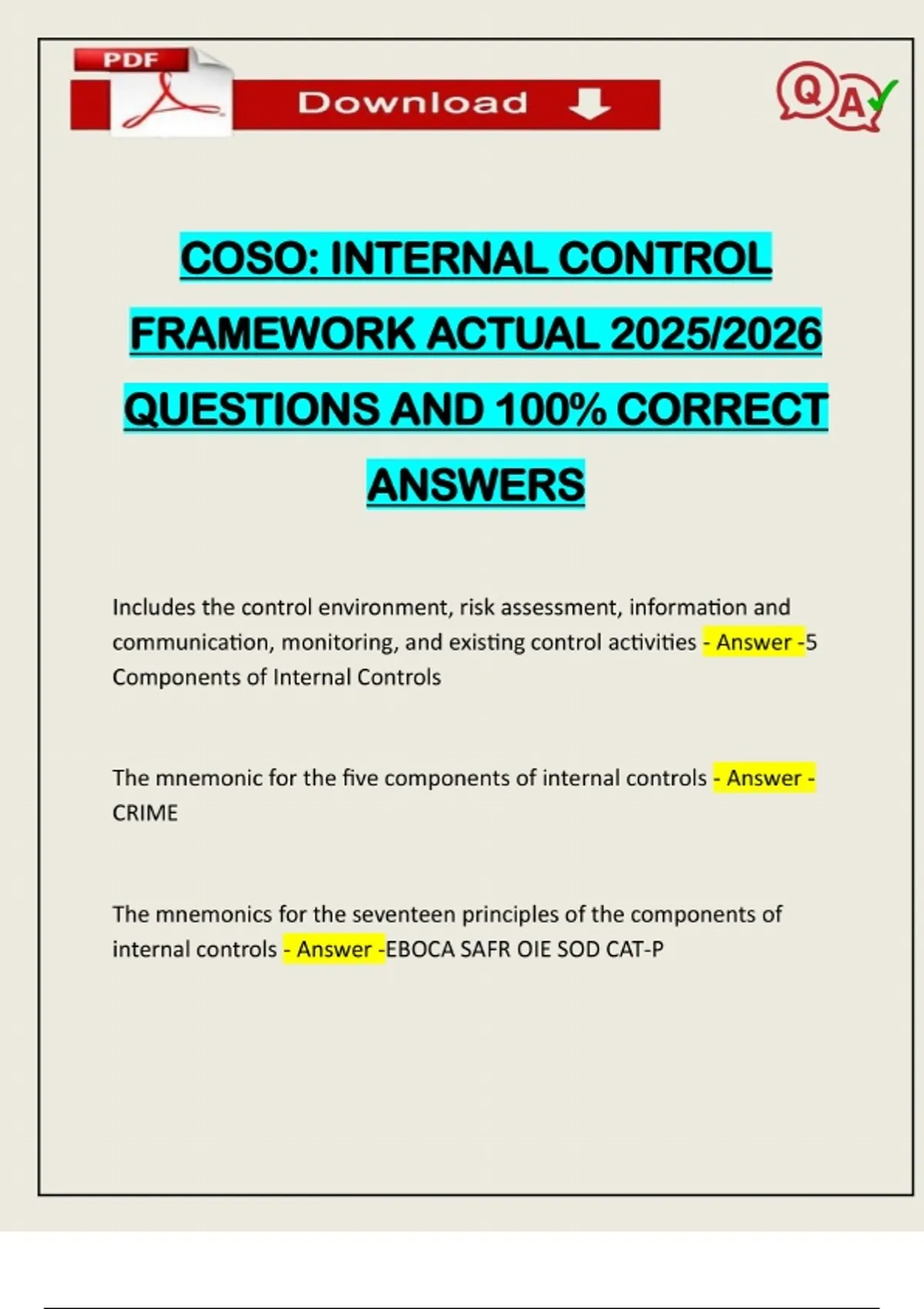 COSO: INTERNAL CONTROL FRAMEWORK ACTUAL 2025/2026 QUESTIONS AND 100% CORRECT ANSWERS Includes the control environment, risk assessment, information and communication, monitoring, and existing control activities - Answer -5 Comp