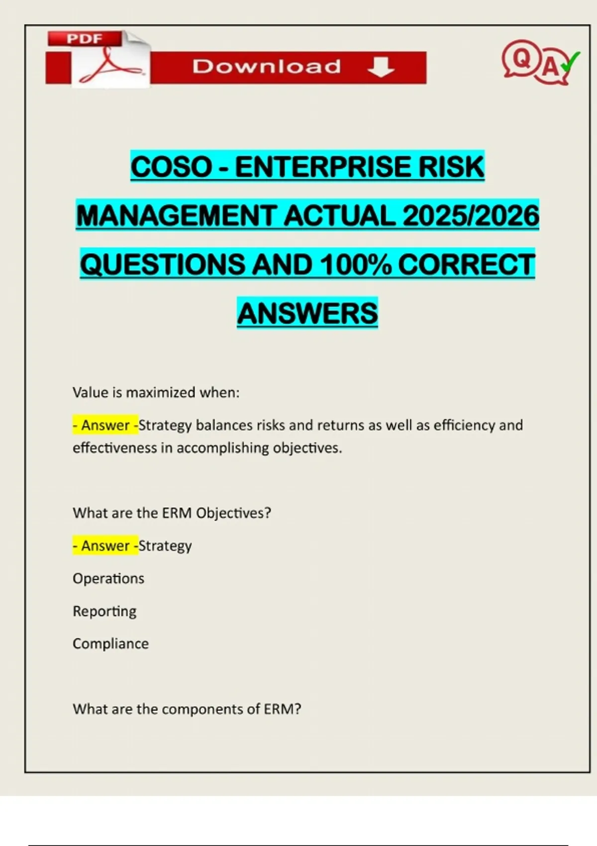 COSO - ENTERPRISE RISK MANAGEMENT ACTUAL 2025/2026 QUESTIONS AND 100% CORRECT ANSWERS Value is maximized when: - Answer -Strategy balances risks and returns as well as efficiency and effectiveness in accomplishing objectives. What are the ERM Objectives? - Answer -Strategy Operations Reporting Compli