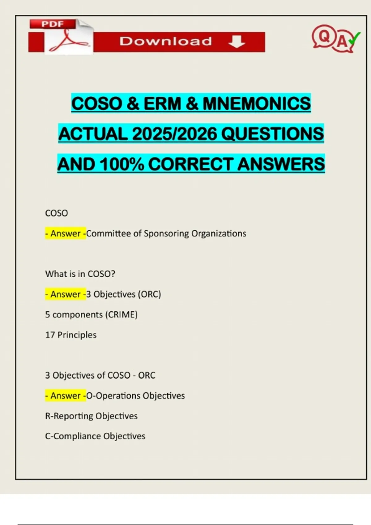 COSO & ERM & MNEMONICS ACTUAL 2025/2026 QUESTIONS AND 100% CORRECT ANSWERS COSO - Answer -Committee of Sponsoring Organizations What is in COSO? - Answer -3 Objectives (ORC) 5 components (CRIME) 17 Principles 3 Objectives of COSO - ORC - Answer -O-Operations Objectives R-Reporting Objectives C-Compliance ObjectivesNeed assistance on Online classes, Exams & Assignments? Reach out for instant help!! Full Course Assistance, Plagiarism-free Essay Writing, Research Paper, Dissertation, Discussion Posts, etc…. Confidential & Secure services. Tutors are available for all subjects! Email now at: Operations Objectives - Answer -Relate to the Effectiveness and Efficiency of an Entity's operations Reporting Objectives