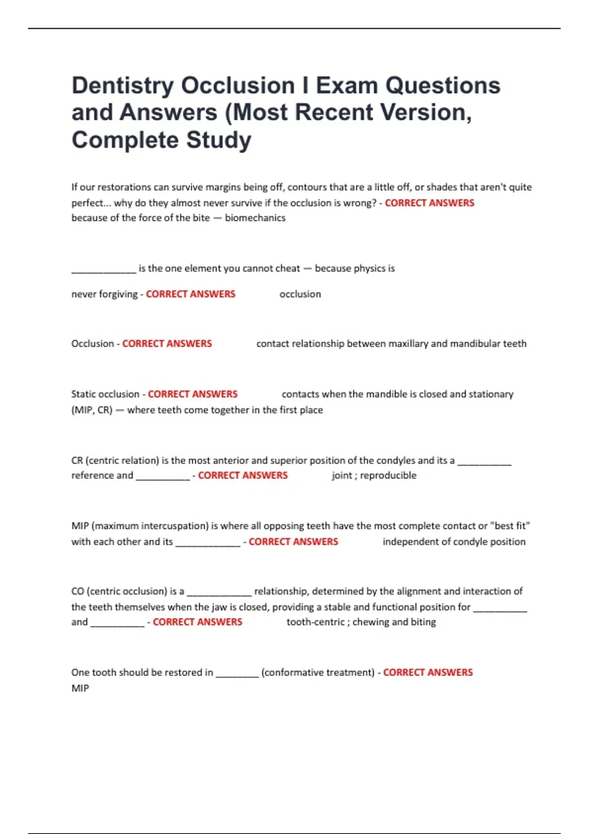 Occlusion - CORRECT ANSWERS contact relationship between maxillary and mandibular teeth