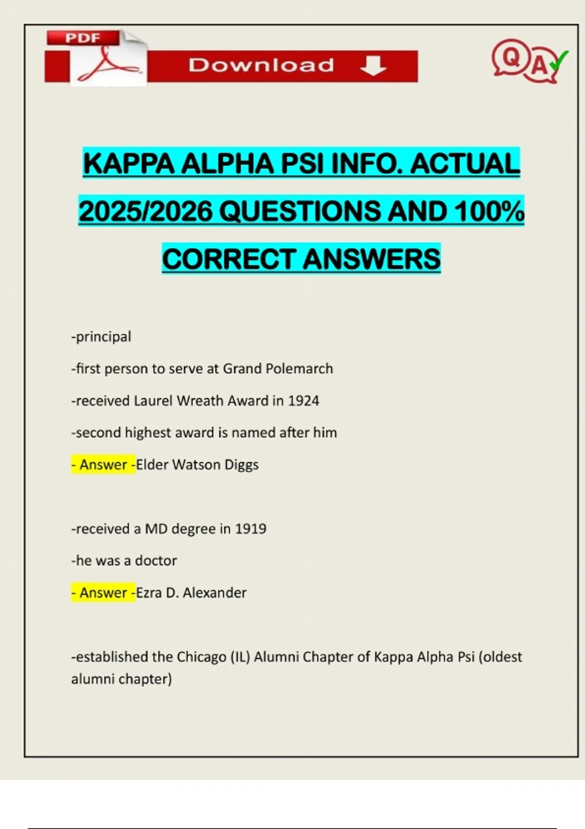 KAPPA ALPHA PSI INFO. ACTUAL 2025/2026 QUESTIONS AND 100% CORRECT ANSWERS -principal -first person to serve at Grand Polemarch -received Laurel Wreath Award in 1924 -second highest award is named after him - Answer -Elder Watson Diggs -received a MD degree in 1919 -he was a doctor - Answer -Ezra D. Alexander -established the Chicago (IL) Alumni Chapter of Kappa Alpha Psi (oldest alumni chapter)Need assistance on Online classes, Exams & Assignments? Reach out for instant help!! Full Course Assistance, Plagiarism-free Essay Writing, Research Paper, Dissertation, Discussion Posts, etc…. Confidential & Secure services. Tutors are available for all subjects! Email now at: - Answer -Byron K. Armstrong -attorney -in 1928, he received his law degree from Detroit College of Law - Answer -Henry T. Asher -earnd his dental degree in 1923 - Answer -Marcus Peter Blakemoe -instrumental in establishing the Beta, G