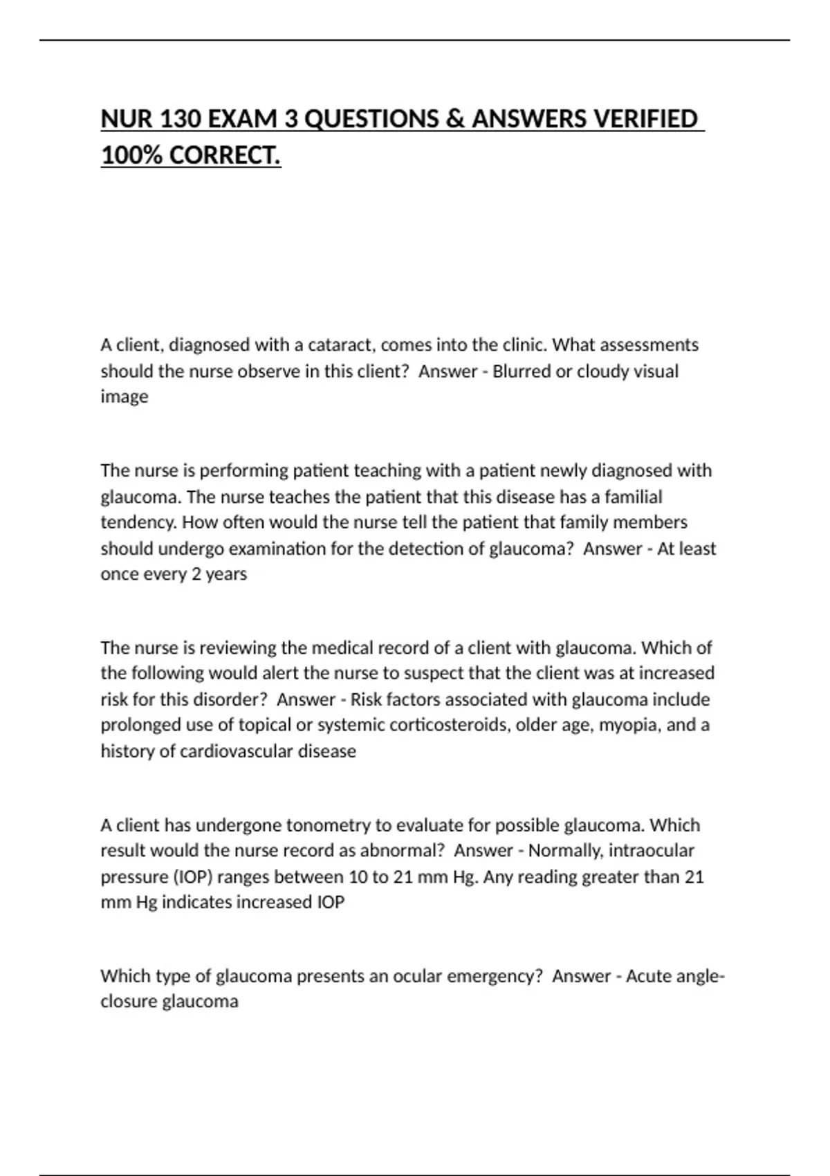 NUR 130 EXAM 3 QUESTIONS & ANSWERS VERIFIED 100% CORRECT.
