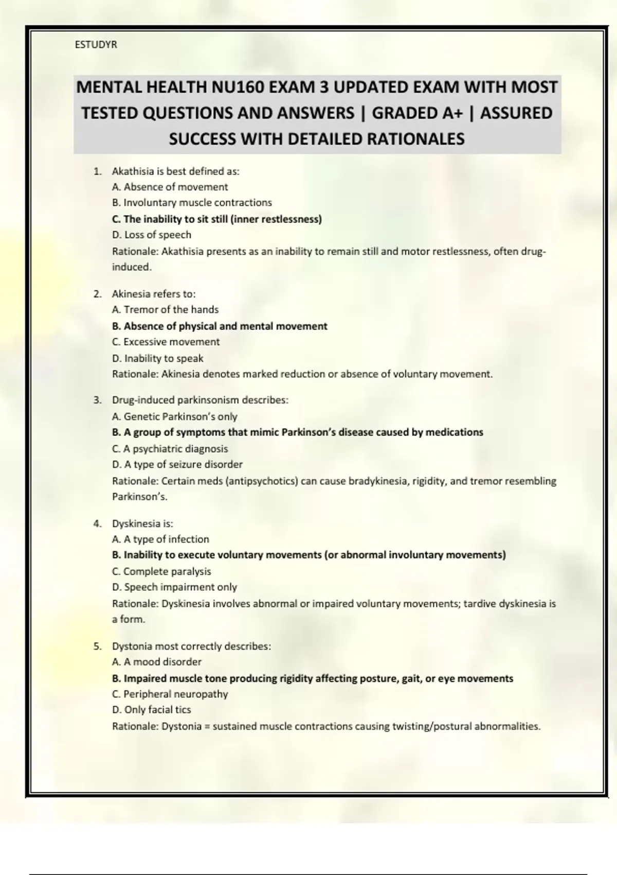 MENTAL HEALTH NU160 EXAM 3 UPDATED EXAM WITH MOST