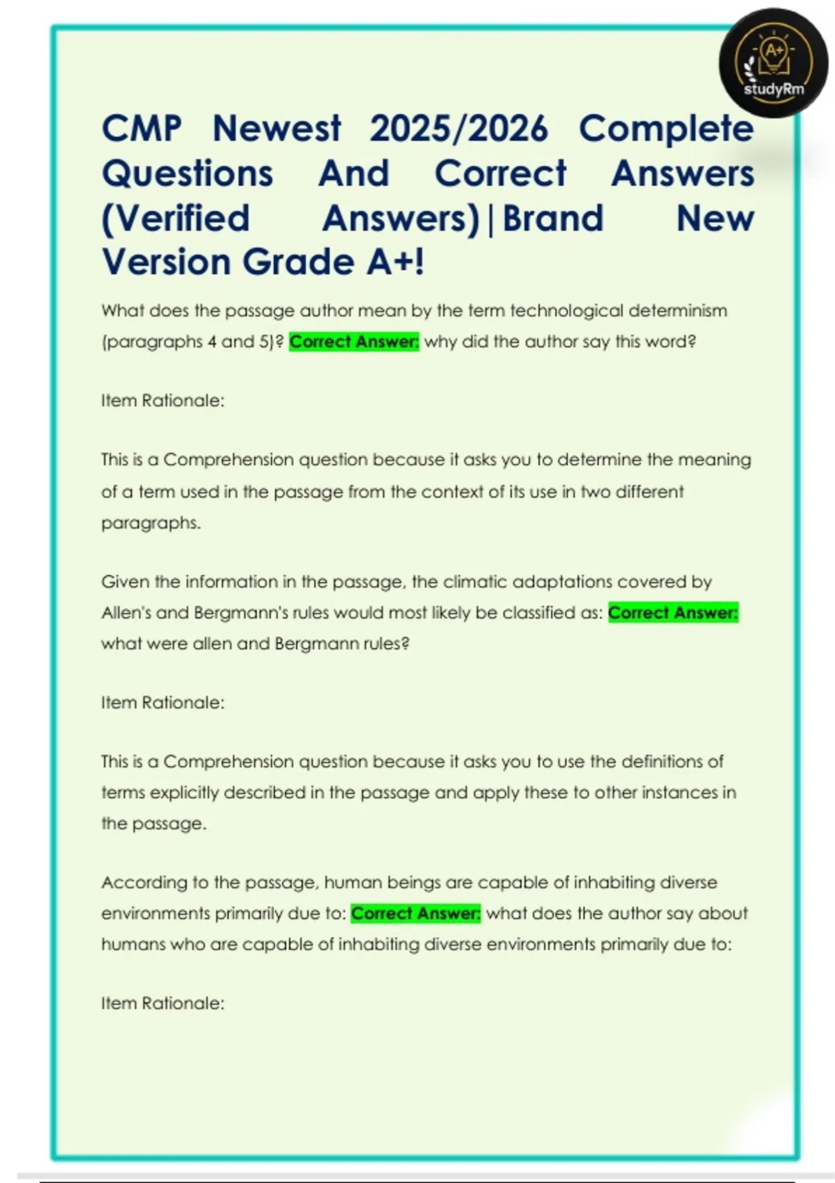 CMP Newest 2025/2026 Complete Questions And Correct Answers (Verified Answers)|Brand New Version Grade A+!