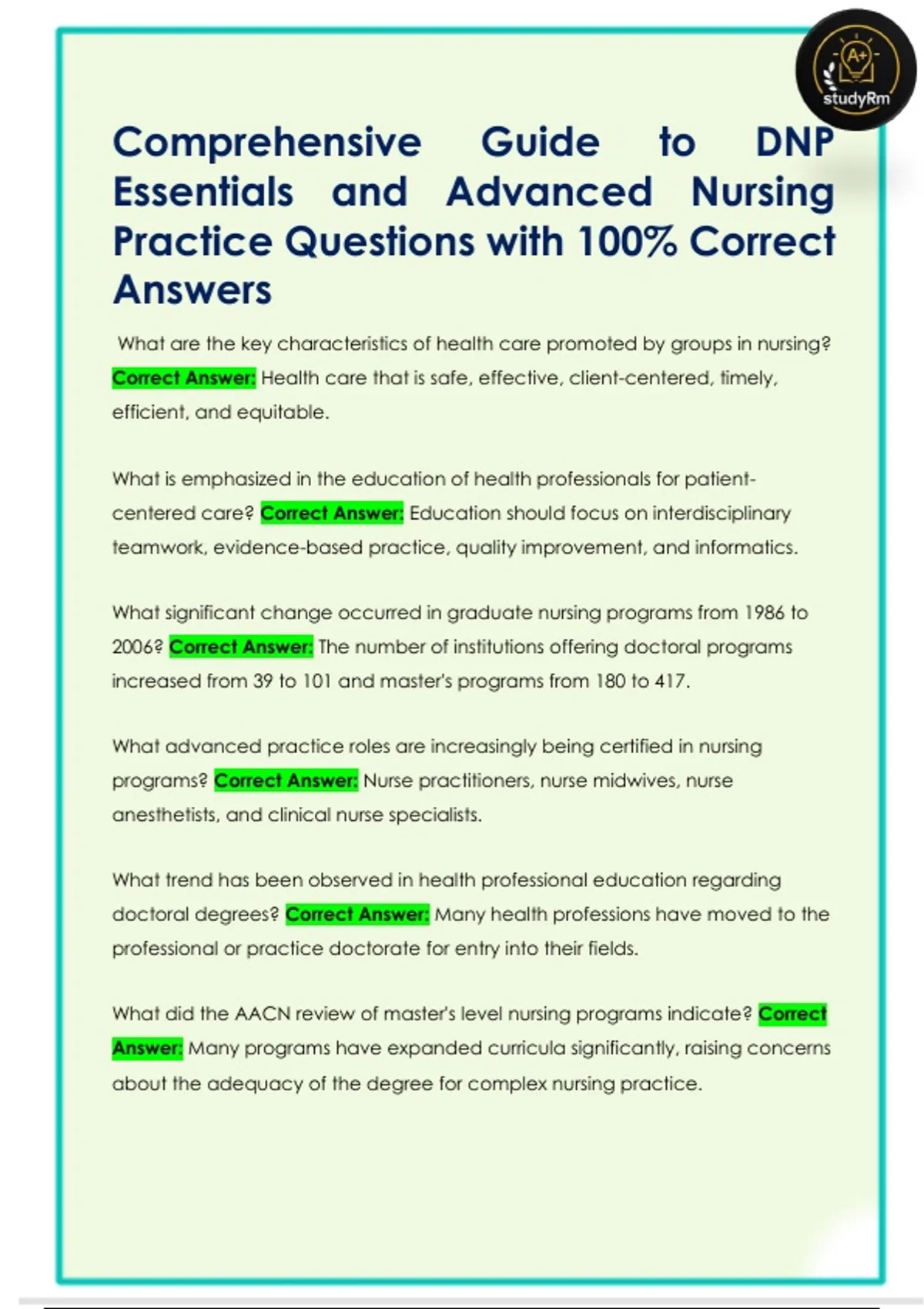 Comprehensive Guide to DNP Essentials and Advanced Nursing Practice Questions with 100% Correct Answers Comprehensive Guide to DNP Essentials and Advanced Nursing Practice Questions with 100% Correct Answers