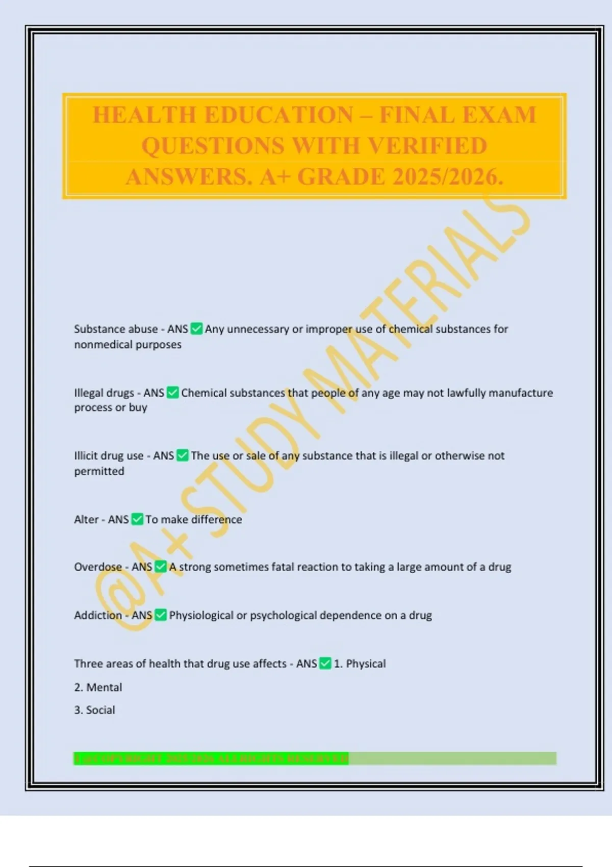 HEALTH EDUCATION – FINAL EXAM QUESTIONS WITH VERIFIED ANSWERS. A+ GRADE 2025/2026.
