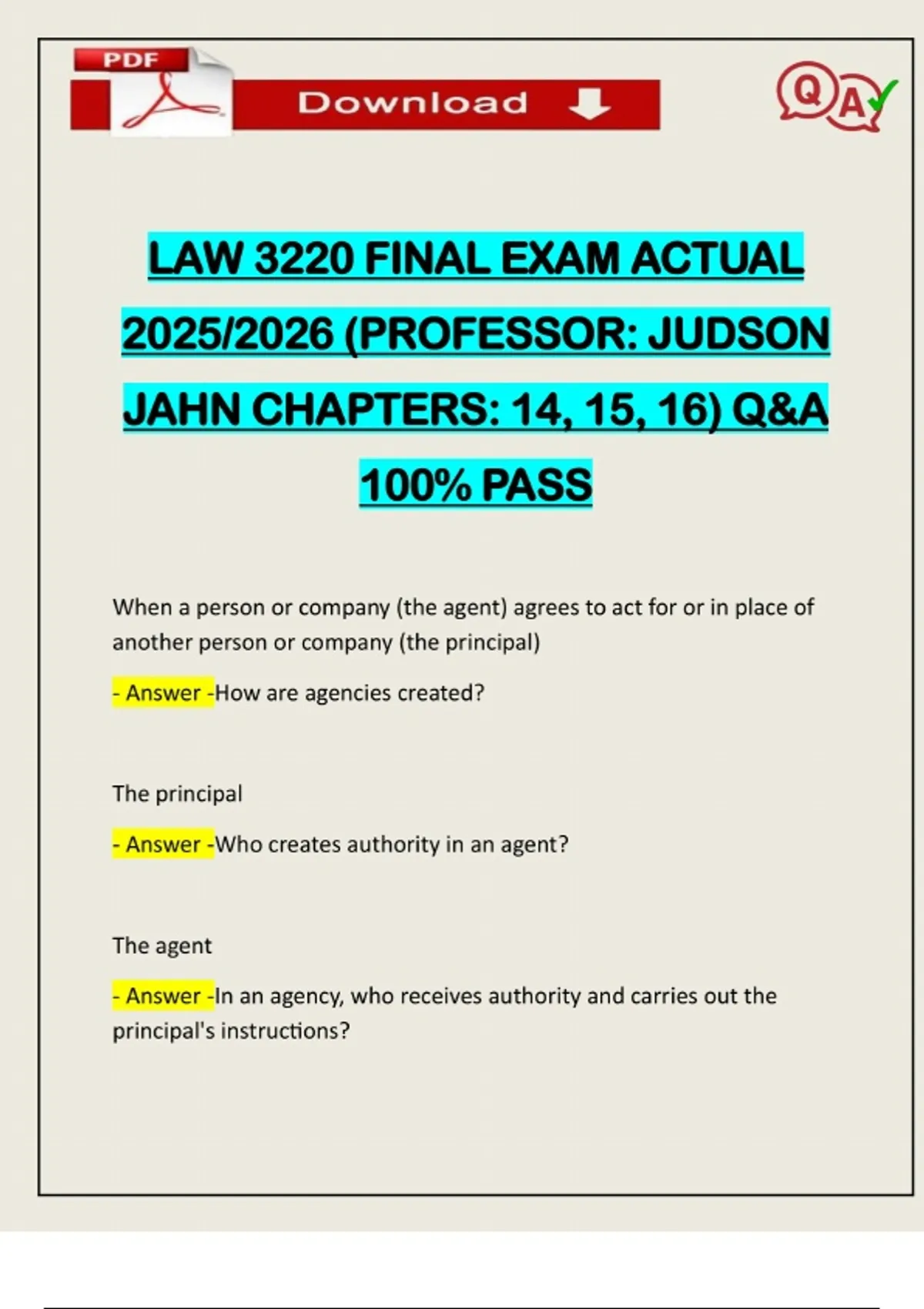 LAW 3220 FINAL EXAM ACTUAL 2025/2026 (PROFESSOR: JUDSON JAHN CHAPTERS: 14, 15, 16) Q&A 100% PASS