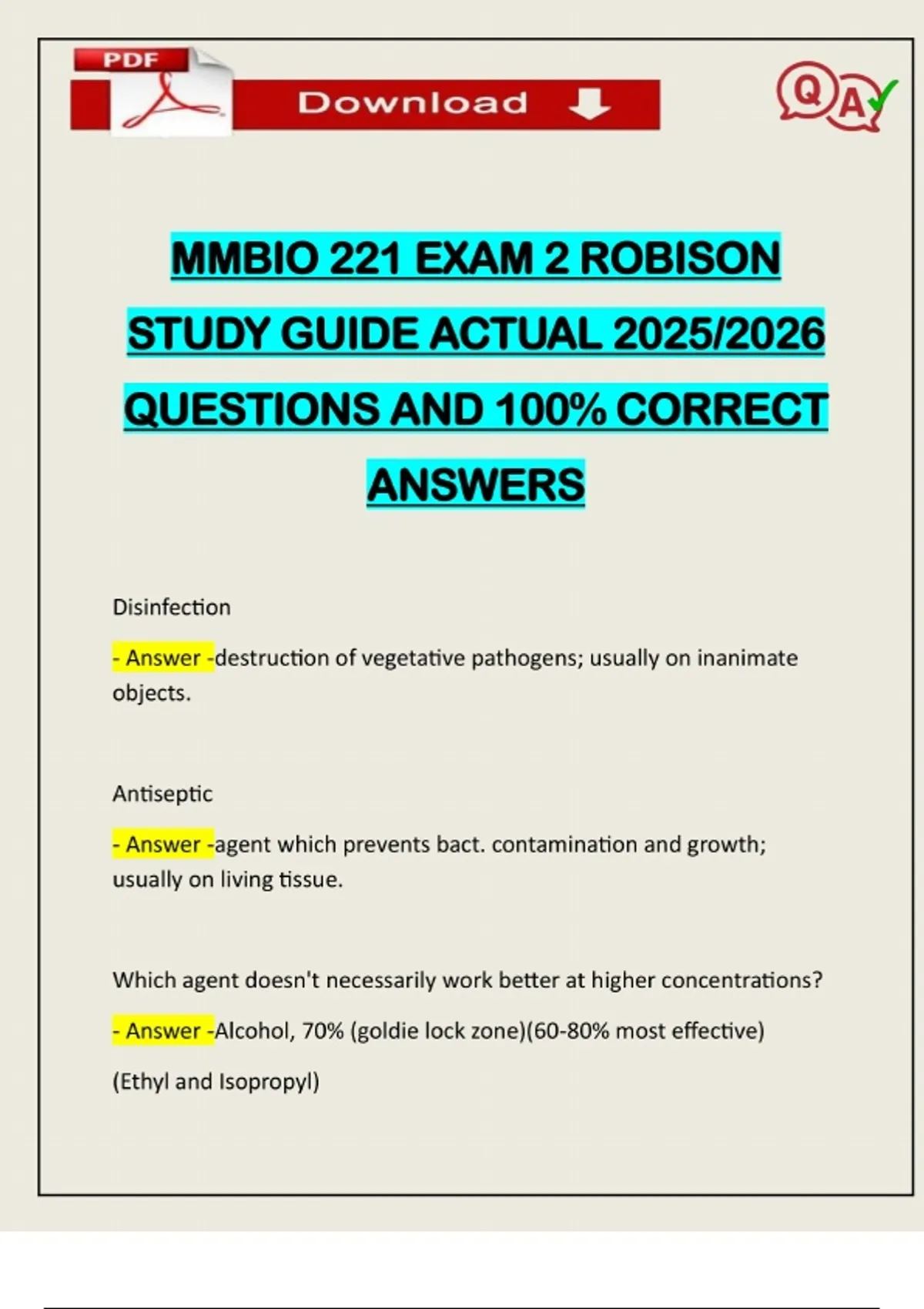 MMBIO 221 EXAM 2 ROBISON STUDY GUIDE ACTUAL 2025/2026 QUESTIONS AND 100% CORRECT ANSWERS Disinfection - Answer -destruction of vegetative pathogens; usually on inanimate objects. Antiseptic - Answer -agent which prevents bact. contamination and growth; usually on living tissue. Which agent doesn't necessarily work better at higher concentrations? - Answer -Alcohol, 70% (goldie lock zone)(60-80% most effective) (Ethyl and Isopropyl)Need assistance on Online classes, Exams & Assignments? Reach out for instant help!! Full Course Assistance, Plagiarism-free Essay Writing, Research Paper, Dissertation, Discussion Posts, etc…. Confidential & Secure services. Tutors are available for all subjects! Email now at: -Alcohol is very effective to resistant to inactivation by organic materials (halogens are not good at this) Name the factors that affect a disinfectant activity. - Answer --Contact Time: longer, the more effective. -Temperature: higher, the more effective. (moist heat better) -pH: depends on chemical; some