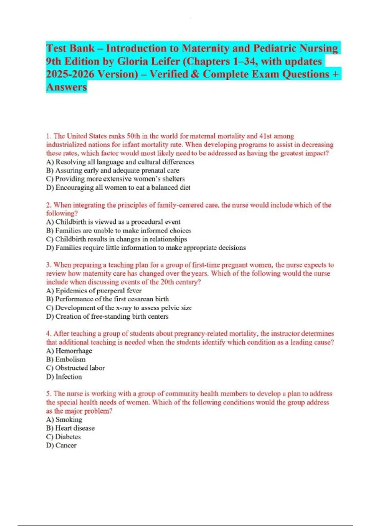Test Bank – Introduction to Maternity and Pediatric Nursing 9th Edition by Gloria Leifer (Chapters 1–34, with updates Version) – Verified & Complete Exam Questions + Answers