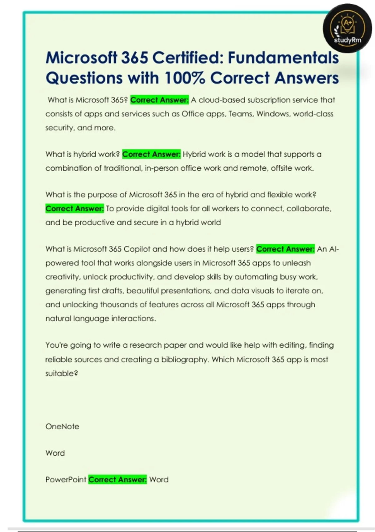 Microsoft 365 Certified: Fundamentals Questions with 100% Correct Answers Microsoft 365 Certified: Fundamentals Questions with 100% Correct Answers