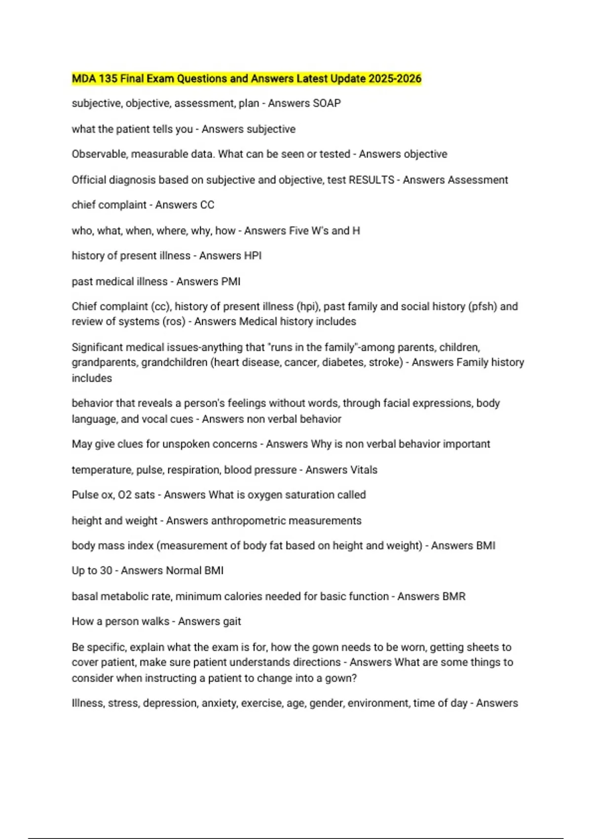 MDA 135 Final Exam Questions and Answers Latest Update subjective, objective, assessment, plan - Answers SOAP what the patient tells you - Answers subjective Observable, measurable data. What can be seen or tested - Answers objective Official diagnosis based on subjective and objective, test RESULTS - Answers Assessment chief complaint - Answers CC who, what, when, where, why, how - Answers Five W's and H history of present illness - Answers HPI past medical illness - Answers PMI Chief complaint (cc), history of present illness (hpi), past family and social history (pfsh) and review of systems (ros) - Answers Medical history includes Significant medical issues-anything that "runs in the family"-among parents, children, grandparents, grandchildren (heart disease, cancer, diabetes, stroke) - Answers Family history includes behavior that reveals a person's feelings without words, through facial expressions, body language, and vocal cues - Answers non verbal behavior May give clues for unspoken concerns - Answers Why is non verbal behavior important temperature, pulse, respiration, blood pressure - Answers Vitals Pulse ox, O2 sats - Answers What is oxygen saturation called height and weight - Answers anthropometric measurements body mass index (measurement of body fat based on height and weight) - Answers BMI Up to 30 - Answers Normal BMI basal metabolic rate, minimum calories needed for basic function - Answers BMR How a person walks - Answers gait Be specific, explain what the exam is for, how the gown needs to be worn, getting sheets to cover patient, make sure patient understands directions - Answers What are some things to consider when instructing a patient to change into a gown? Illness, stress, depression, anxiety, exercise, age, gender, environment, time of day - Answers What can affect a person's temperature? Fever of 102 or higher - Answers Pyrexia Fever 105° and above - Answers hyperpyrexia 98.6 - Answers Normal oral temperature 99.6 - Answers Normal rectal temperature 97.6 - Answers Normal axillary temperature 98.6 - Answers Normal tympanic temperature 98.6 - Answers normal temporal temperature 100.4 - Answers Official start of fever Anxiety, depression, stress, exercise, illness, time of day, position, medication, body type, blood volume, alcohol, drugs - Answers What can affect a person's pulse rate, rhythm, volume - Answers What are the characteristics of pulse radial - Answers What artery is used most often for pulse rate