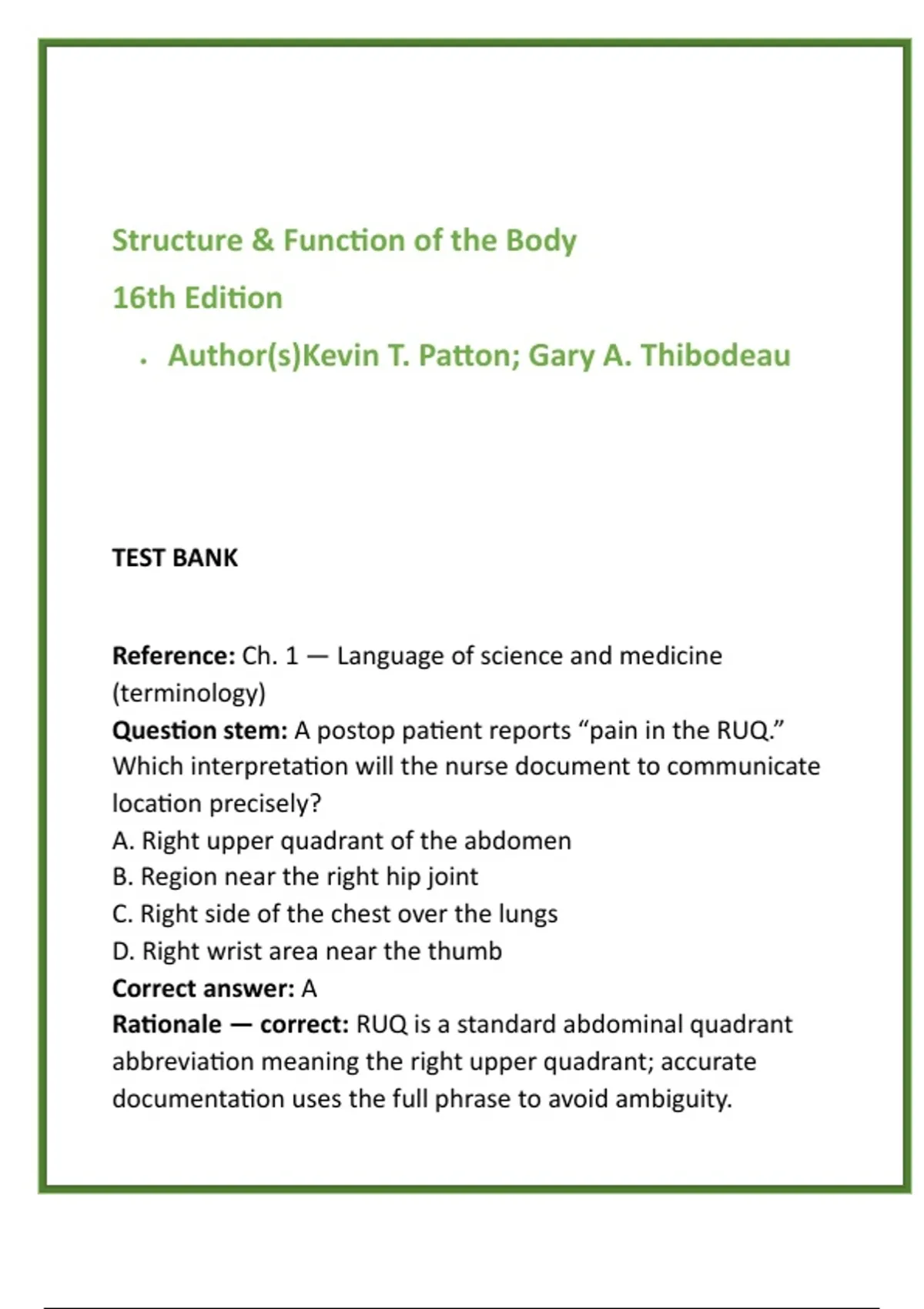 Rationale — correct: RUQ is a standard abdominal quadrant