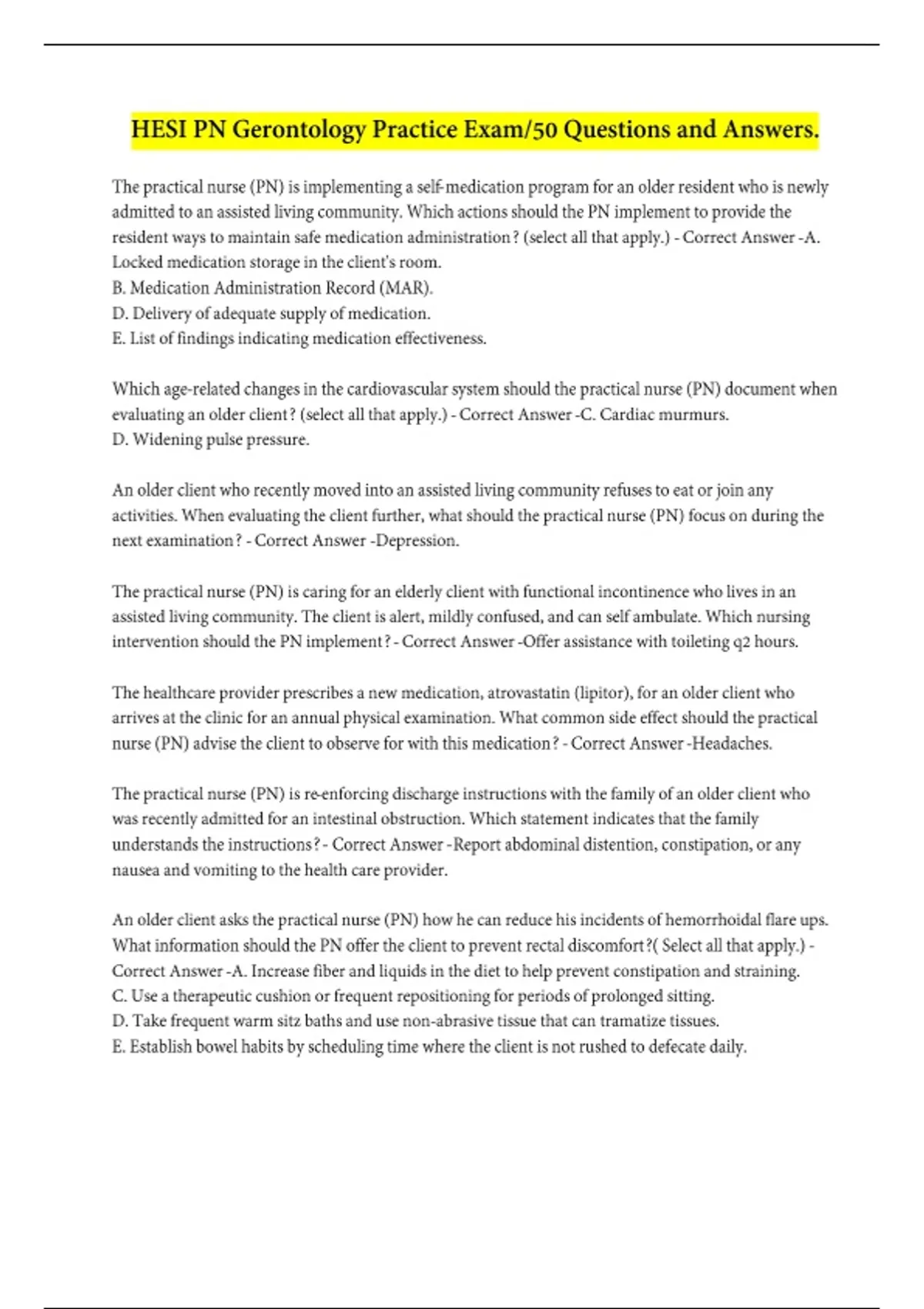 HESI PN Gerontology Practice Exam/50 Questions and Answers.