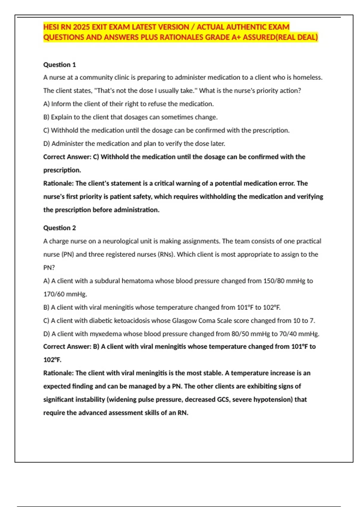 HESI RN 2025 EXIT EXAM LATEST VERSION / ACTUAL AUTHENTIC EXAM QUESTIONS AND ANSWERS PLUS RATIONALES GRADE A+ ASSURED(REAL DEAL)