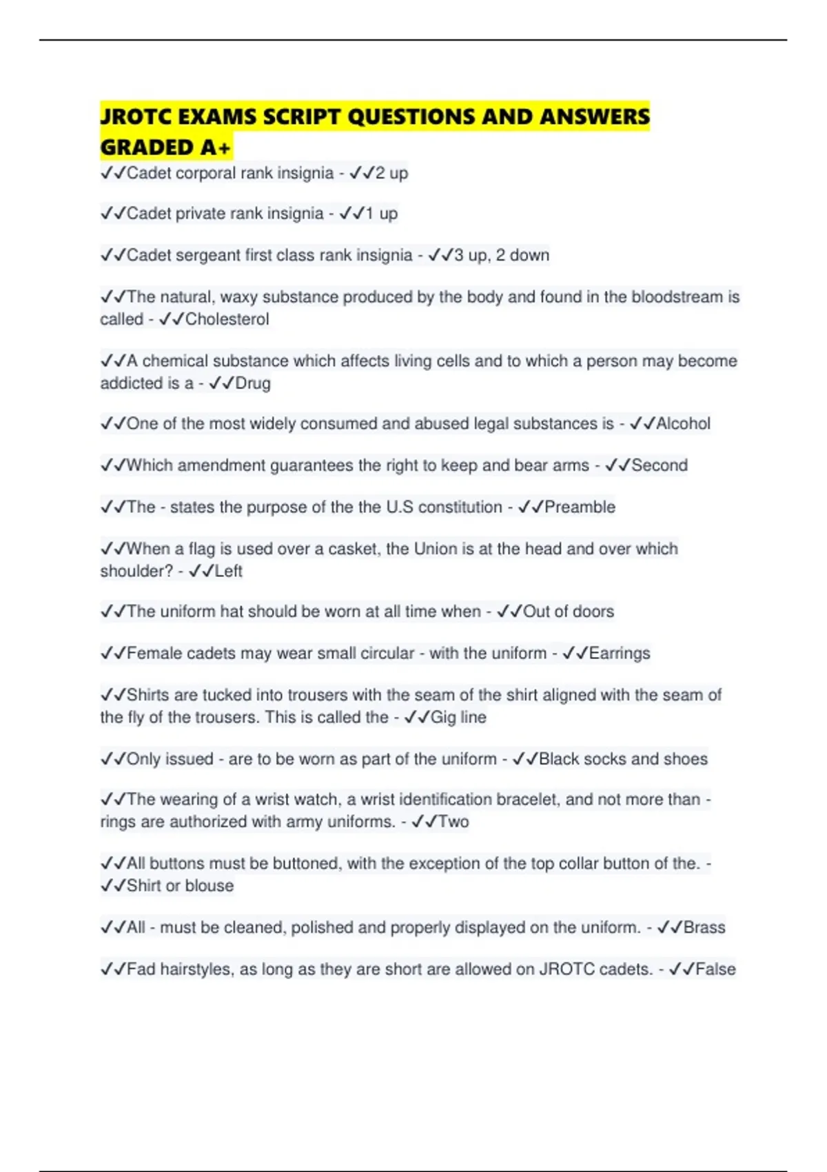 JROTC EXAMS SCRIPT QUESTIONS AND ANSWERS GRADED A+