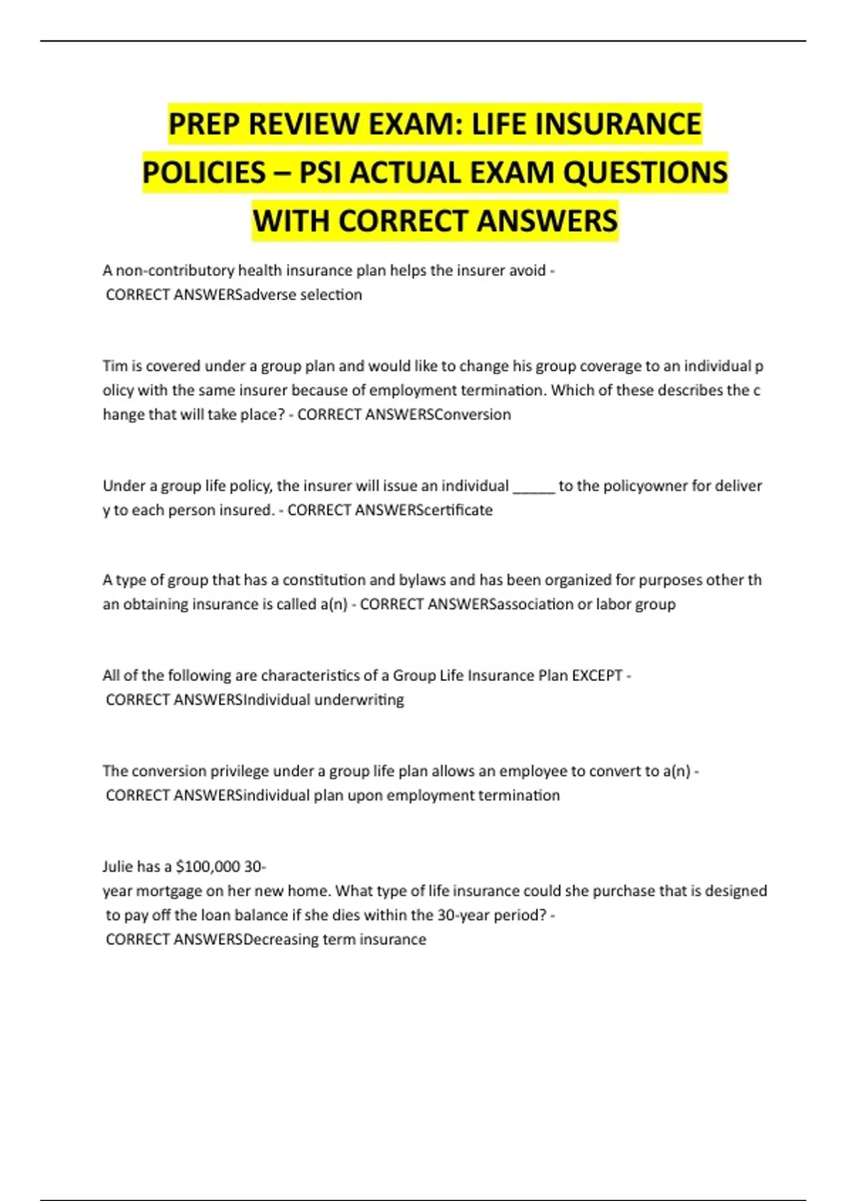 PREP REVIEW EXAM LIFE INSURANCE POLICIES – PSI ACTUAL EXAM QUESTIONS WITH CORRECT