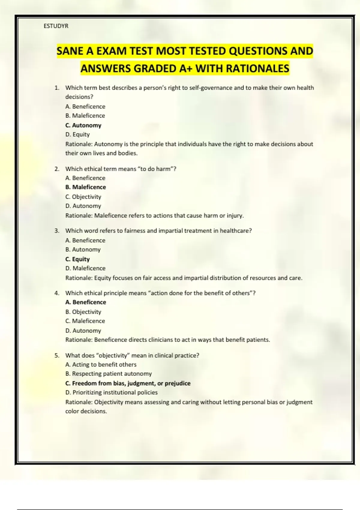 SANE A EXAM TEST MOST TESTED QUESTIONS AND ANSWERS GRADED A+ WITH RATIONALES