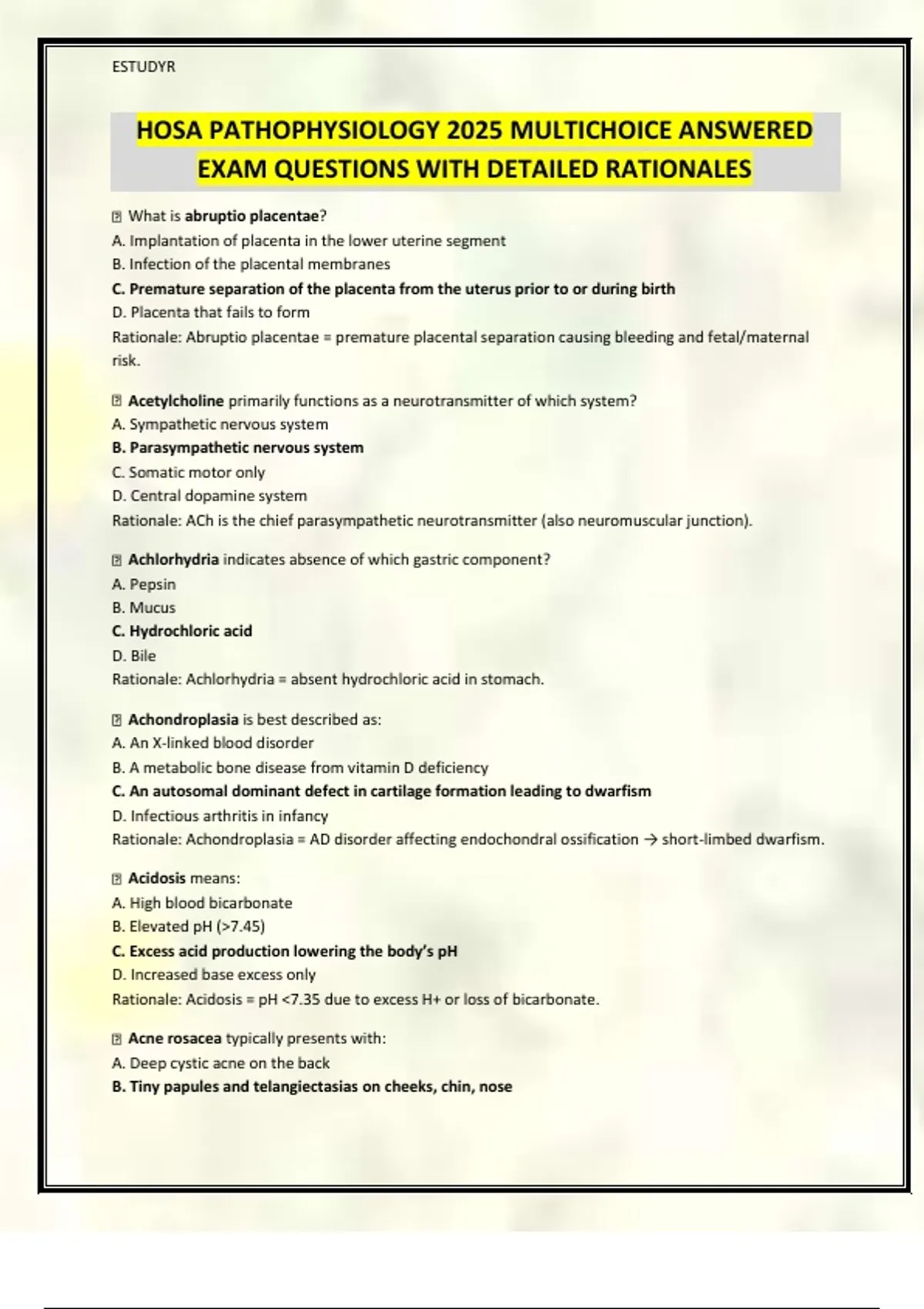 HOSA PATHOPHYSIOLOGY 2025 MULTICHOICE ANSWERED EXAM QUESTIONS WITH DETAILED RATIONALES