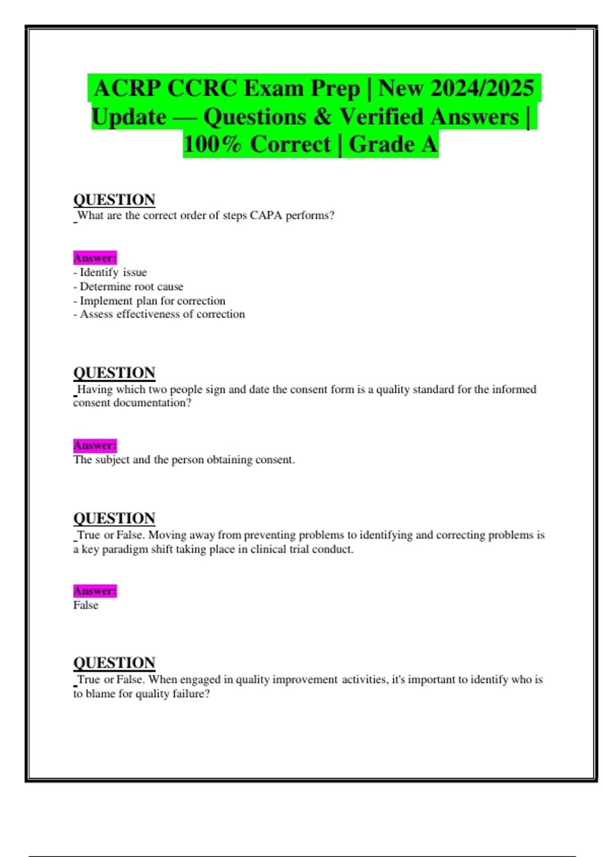 This ACRP CCRC Exam Prep Pack (2024/2025) contains verified, up-to-date questions and 100% correct answers designed to help clinical research professionals succeed. It covers essential clinical operations, ethics, and trial management principles tested in the ACRP exam. Ideal for those pursuing CCRC certification, ensuring top results and full exam readiness.