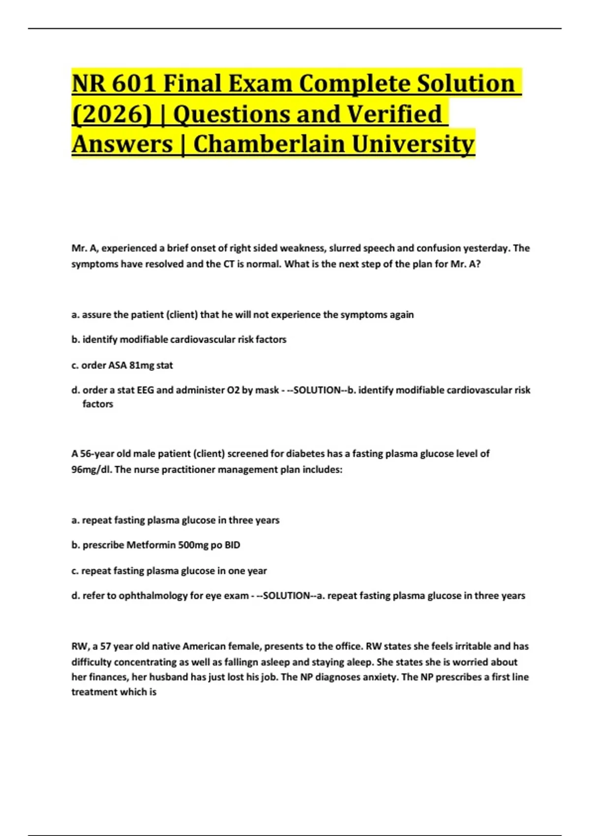 NR 601 Final Exam Complete Solution (2026) | Questions and Verified Answers | Chamberlain University NR 601 Final Exam Complete Solution (2026) | Questions and Verified Answers | Chamberlain University