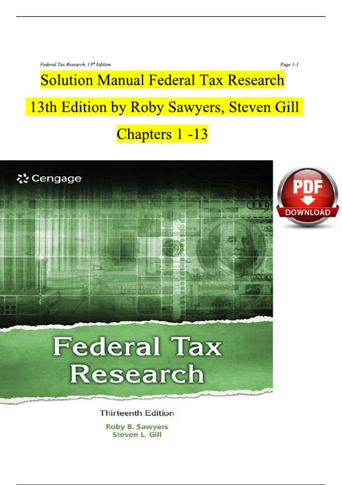 The complete solution manual covering Chapters 1 through 13 of Federal Tax Research, 13th Edition by Roby B. Sawyers and Steven L. Gill. It includes solutions and discussion questions related to tax practice, ethics, compliance, planning, and litigation.