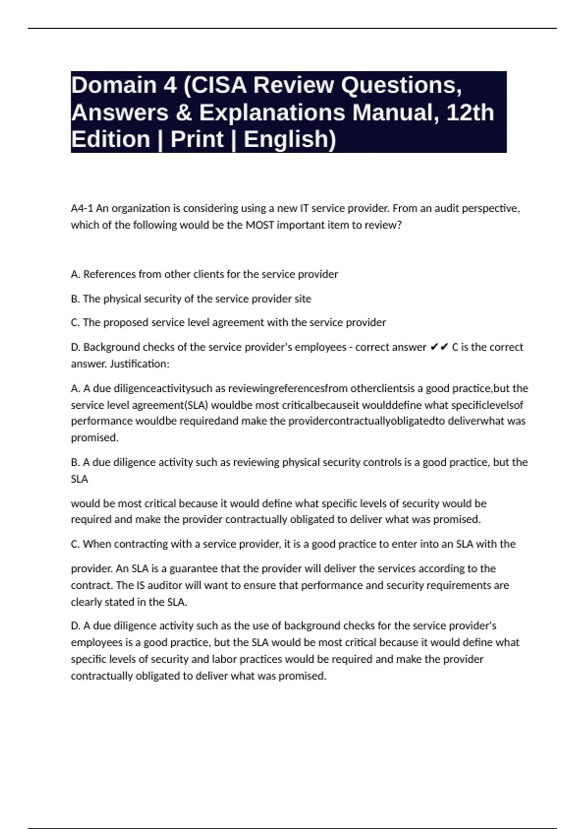 D. Background checks of the service provider's employees - correct answer ✔✔ C is the correct