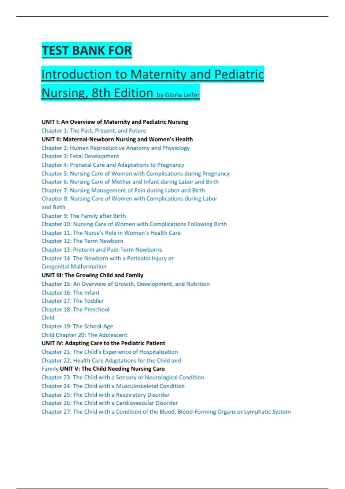 Download the verified Test Bank for Introduction to Maternity and Pediatric Nursing 8th Edition by Gloria Leifer, updated for 2025/2026. Includes complete chapter-wise multiple choice questions (MCQs) with accurate verified answers. Perfect for nursing students preparing for maternity, pediatric, and clinical exams. Includes: All chapters with verified MCQs and detailed answers A+ graded and updated 2025/2026 content Covers key maternity and pediatric nursing topics Helps in exam preparation, quizzes, and concept review 100% Trusted by nursing students worldwide for accuracy, clarity, and guaranteed success.