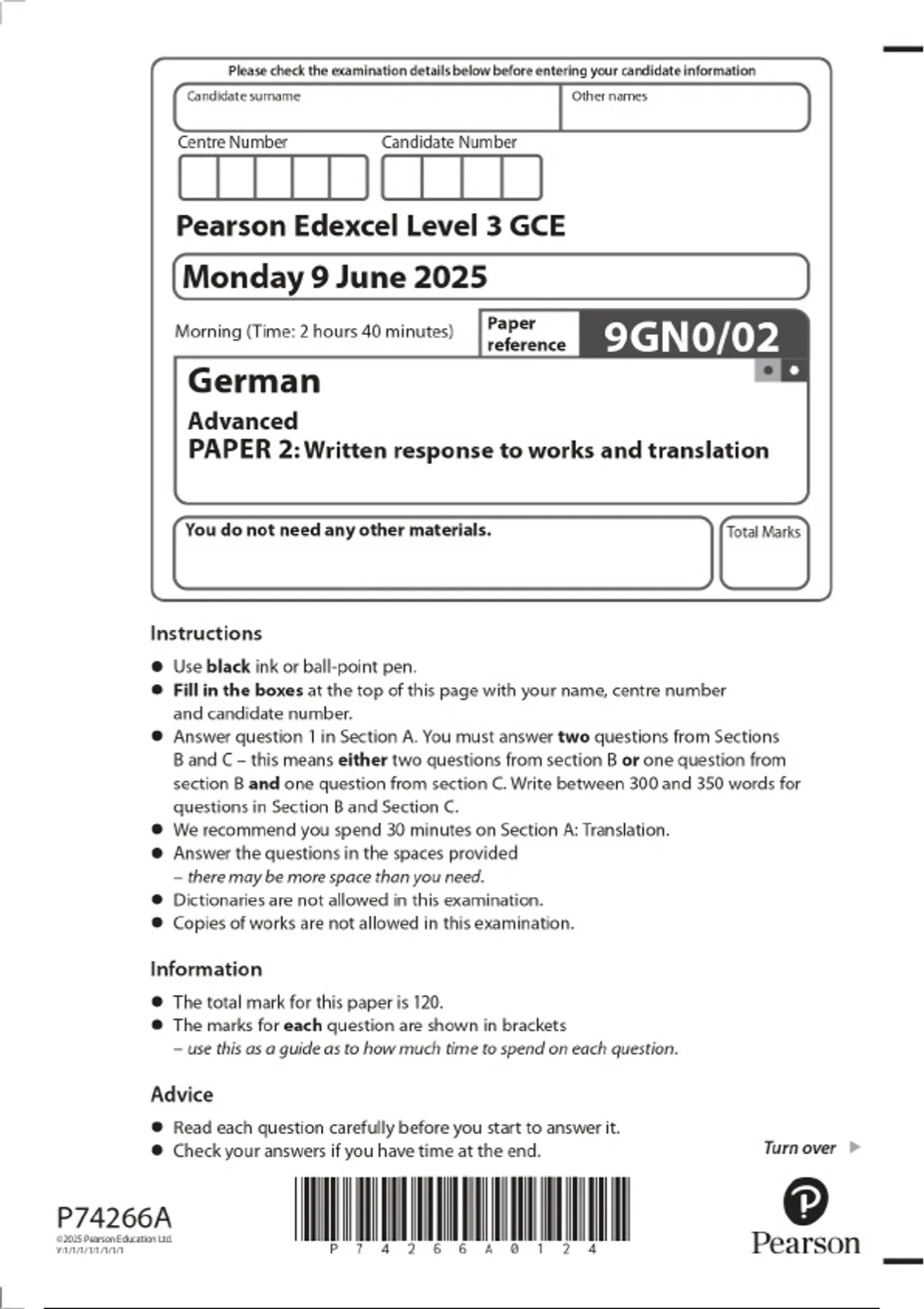2025 Pearson Edexcel Level 3 GCE Monday 9 June 2025 German Advanced PAPER 2: Written response to works and translation Combined Question Paper & Marking Scheme