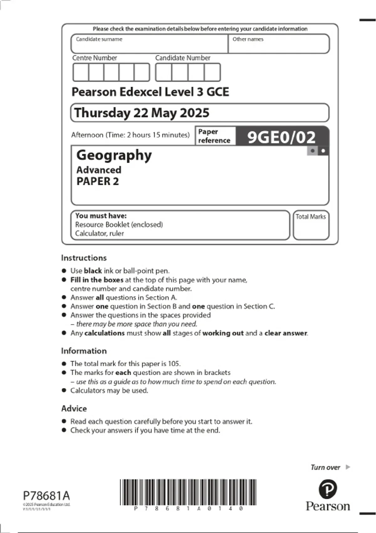 2025 Pearson Edexcel Level 3 GCE Thursday 22 May 2025 Geography Advanced PAPER 2 Combined Question Paper & Marking Scheme