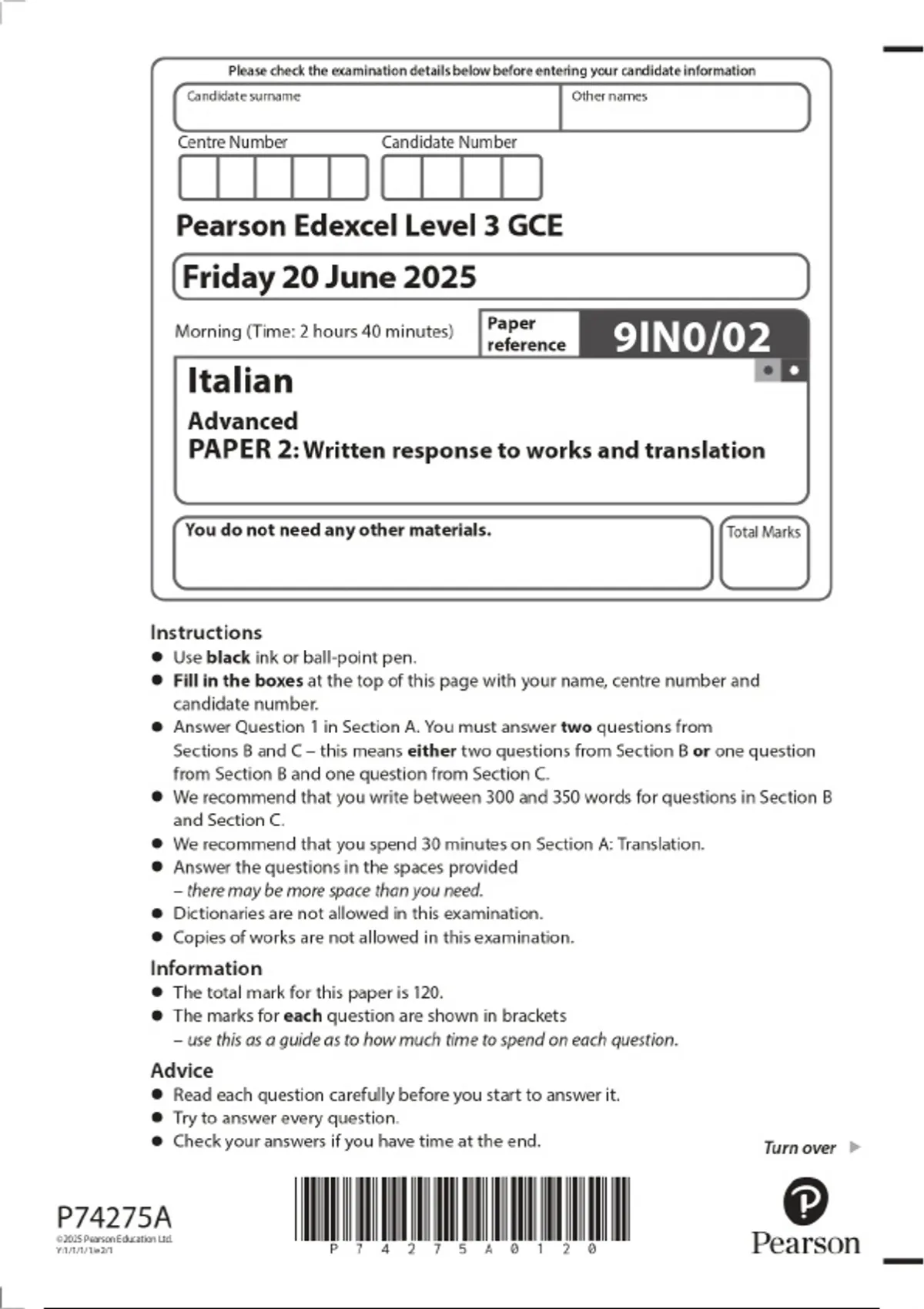 2025 Pearson Edexcel Level 3 GCE Friday 20 June 2025 Italian Advanced PAPER 2: Written response to works and translation Combined Question Paper & Marking Scheme