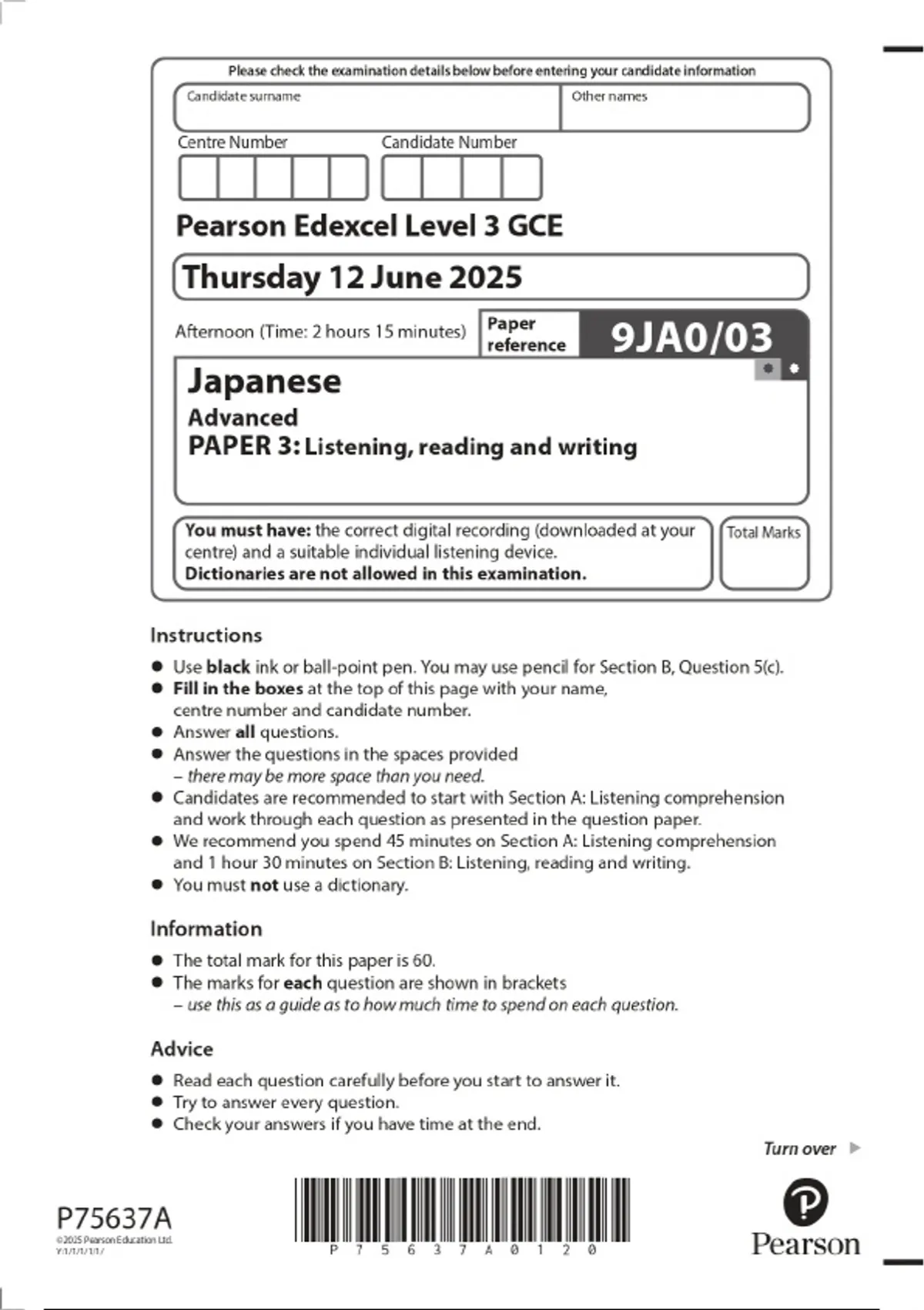 2025 Pearson Edexcel Level 3 GCE Thursday 12 June 2025 Japanese Advanced PAPER 3: Listening, reading and writing Combined Question Paper & Marking Scheme