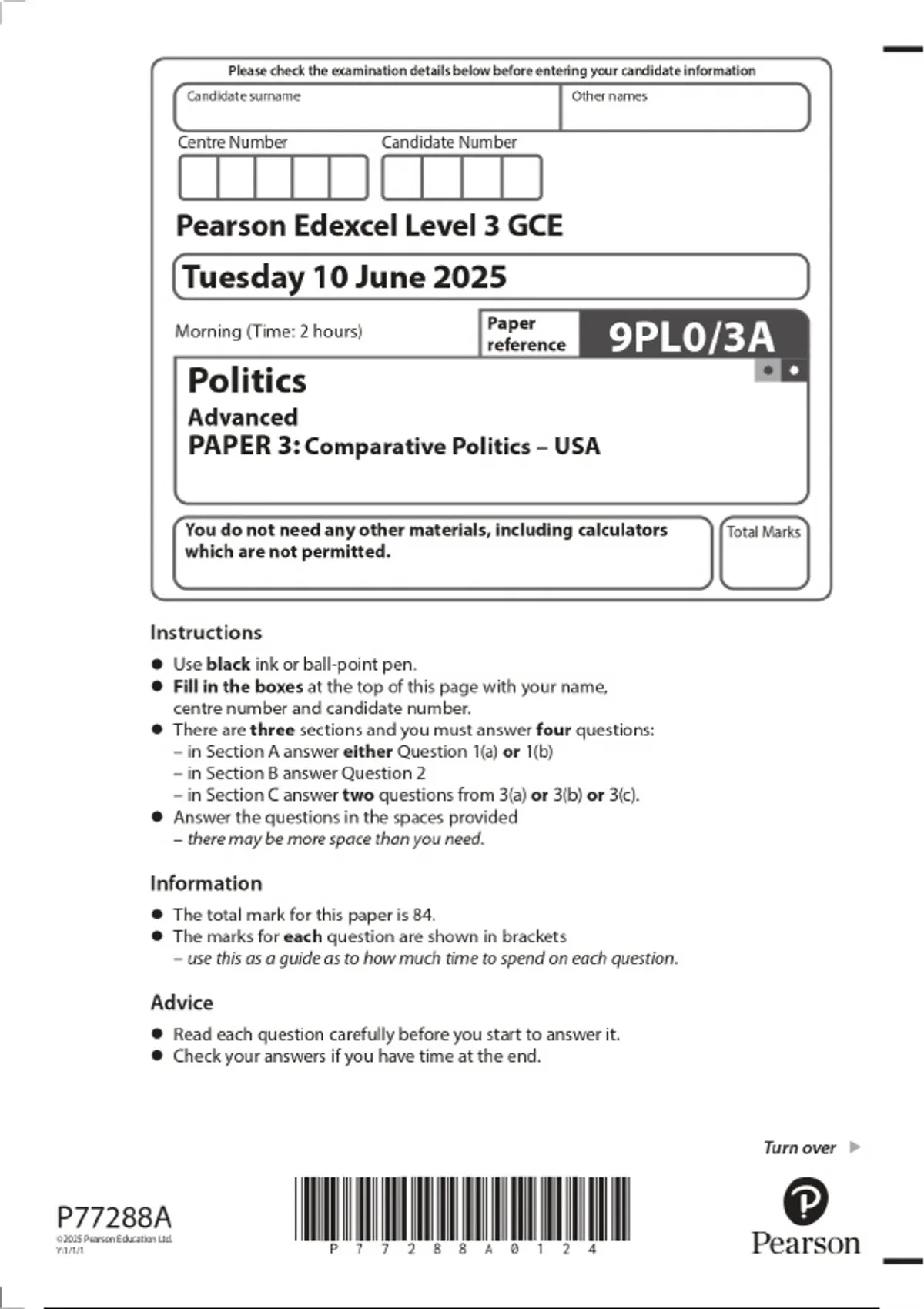 2025 Pearson Edexcel Level 3 GCE Tuesday 10 June 2025 Politics Advanced PAPER 3: Comparative Politics – USA Combined Question Paper & Marking Scheme
