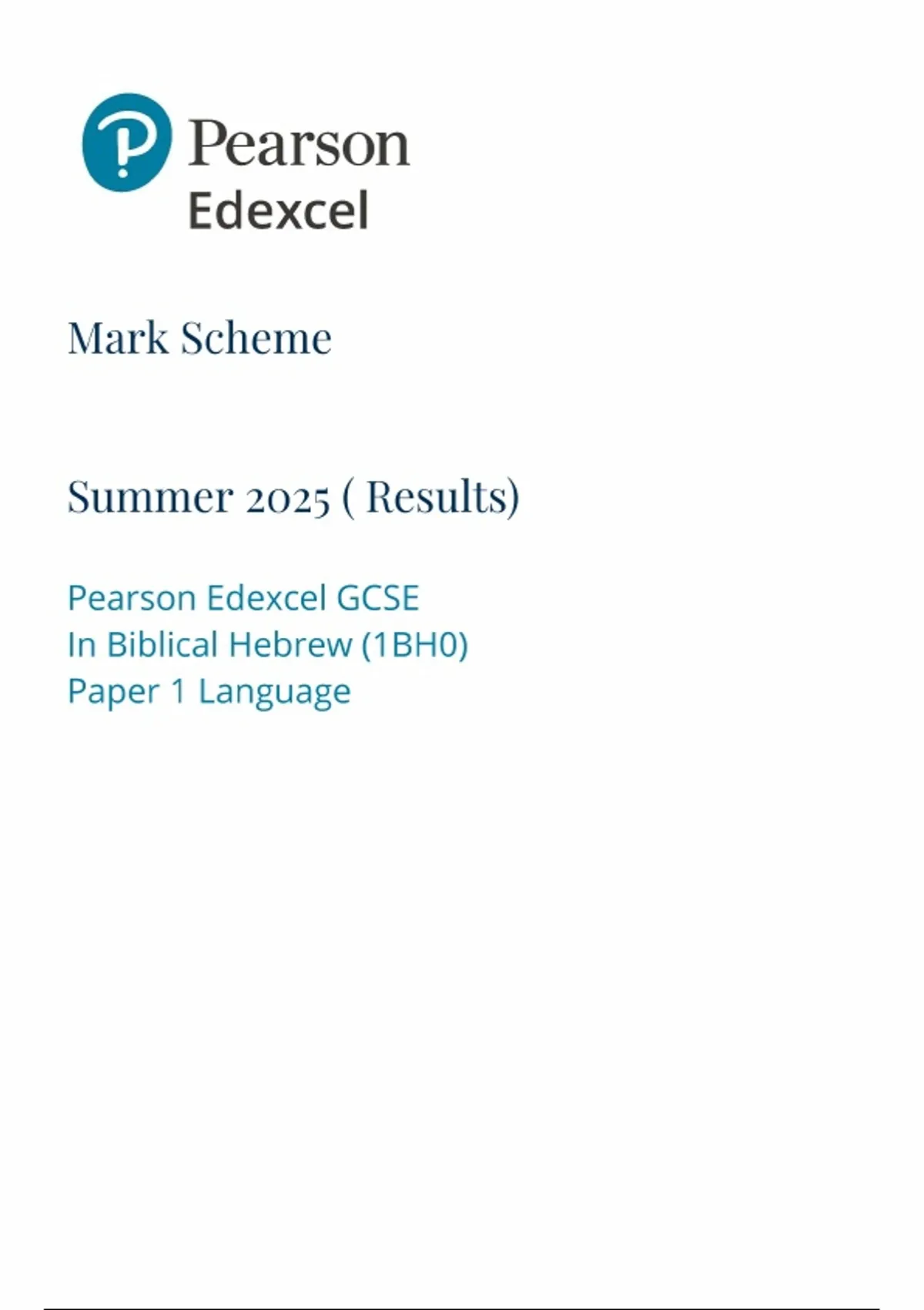 2025 PEARSON EDEXCEL GCSE BIBLICAL HEBREW PAPER 1 MARK SCHEME (1BH0/01: COMPONENT 1: Language)