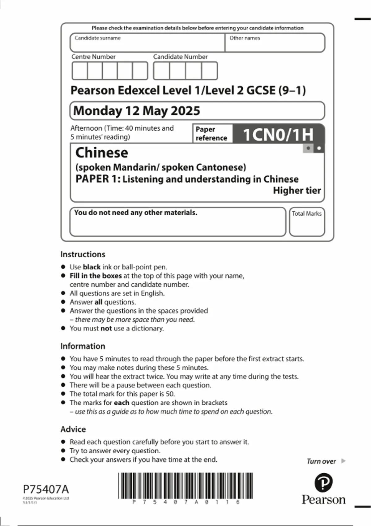 2025 PEARSON EDEXCEL GCSE CHINESE PAPER 1 QUESTION PAPER (1CN0/1H:Higher tier: Listening and understanding in Chinese(spoken Mandarin/ spoken Cantonese))