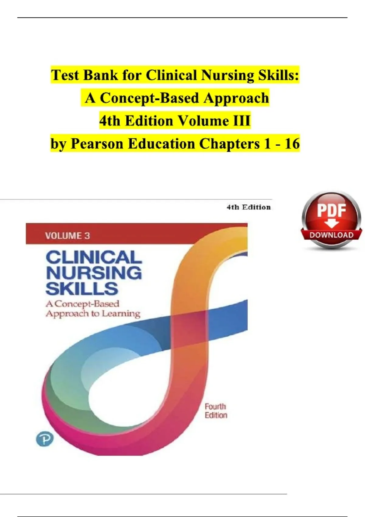 Full Test Bank for Clinical Nursing Skills: A Concept-Based Approach, 4th Edition. This comprehensive resource provides exam questions and answers organized by key nursing concepts, including Assessment, Caring Interventions, Comfort, Fluids and Electrolytes, Infection, Mobility, Nutrition, Oxygenation, and Perioperative Care. Ideal for students in foundational and clinical nursing programs adopting a concept-based curriculum.