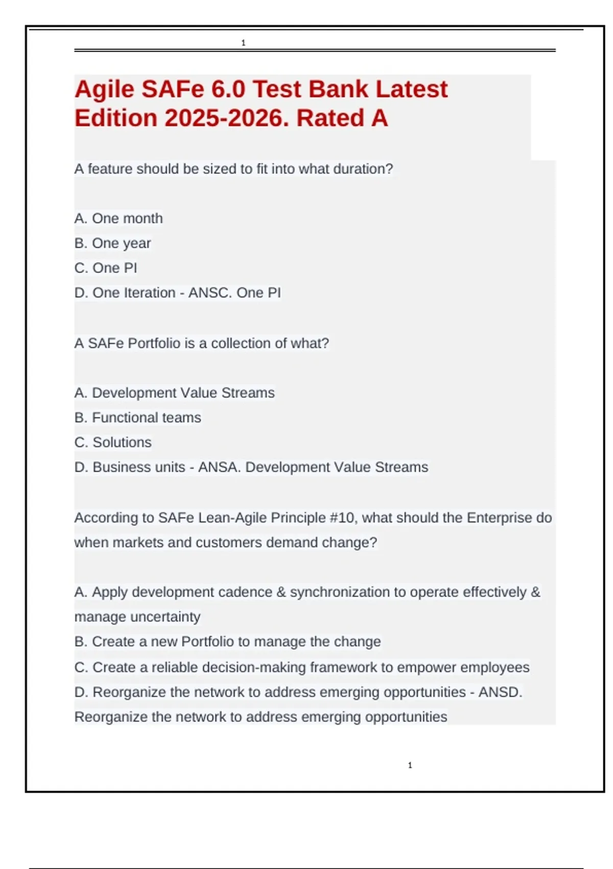 The Agile SAFe 6.0 Test Bank Latest Edition provides a complete collection of verified exam questions and answers designed to prepare professionals for SAFe 6.0 certification. Covering Agile principles, Lean Portfolio Management, DevOps, and team collaboration, this resource ensures deep understanding of the Scaled Agile Framework. Rated A for accuracy and quality, it helps learners enhance Agile expertise and achieve certification success in the 2025–2026 testing cycle.