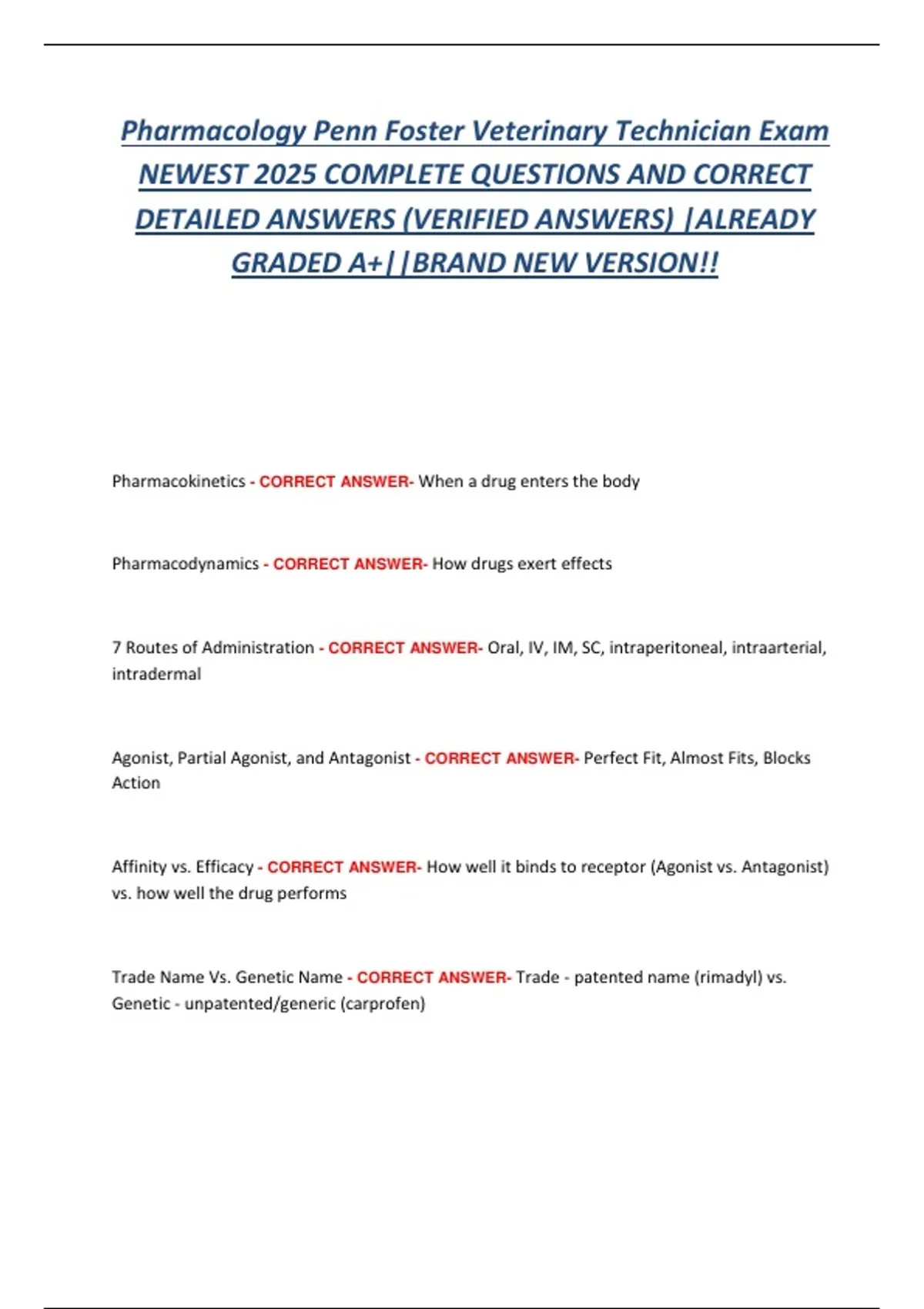 This comprehensive Pharmacology Exam is designed for students enrolled in the Penn Foster Veterinary Technician Program. The exam evaluates understanding of drug classifications, mechanisms of action, dosage calculations, routes of administration, legal considerations, and safe handling practices in veterinary medicine. This study guide includes real-world scenarios, practice questions with rationales, and key concepts aligned with the NAVTA and AVMA standards to prepare students for both coursework assessments and licensure exams (VTNE).