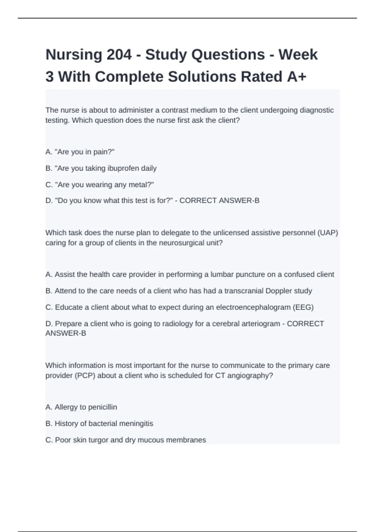 The nurse is about to administer a contrast medium to the client undergoing diagnostic testing. Which question does the nurse first ask the client? A. "Are you in pain?" B. "Are you taking ibuprofen daily C. "Are you wearing any metal?" D. "Do you know what this test is for?" - CORRECT ANSWER-B Which task does the nurse plan to delegate to the unlicensed assistive personnel (UAP) caring for a group of clients in the neurosurgical unit? A. Assist the health care provider in performing a lumbar puncture on a confused client B. Attend to the care needs of a client who has had a transcranial Doppler study C. Educate a client about what to expect during an electroencephalogram (EEG) D. Prepare a client who is going to radiology for a cerebral arteriogram - CORRECT ANSWER-B Which information is most important for the nurse to communicate to the primary care provider (PCP) about a client who is scheduled for CT angiography? A. Allergy to penicillin B. History of bacterial meningitis C. Poor skin turgor and dry mucous membranes D. The client's dose of metformin (Glucophage) held today - CORRECT ANSWER-C