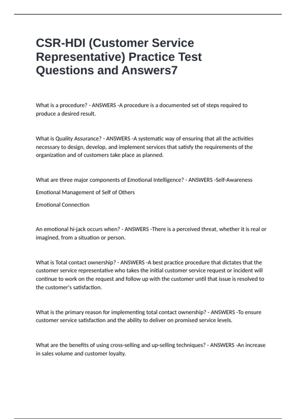 CSR-HDI (Customer Service Representative) Practice Test Questions and Answers What is a procedure? - ANSWERS -A procedure is a documented set of steps required to produce a desired result. What is Quality Assurance? - ANSWERS -A systematic way of ensuring that all the activities necessary to design, develop, and implement services that satisfy the requirements of the organization and of customers take place as planned. What are three major components of Emotional Intelligence? - ANSWERS -Self-Awareness Emotional Management of Self of Others Emotional Connection An emotional hi-jack occurs when? - ANSWERS -There is a perceived threat, whether it is real or imagined, from a situation or person. What is Total contact ownership? - ANSWERS -A best practice procedure that dictates that the customer service representative who takes the initial customer service request or incident will continue to work on the request and follow up with the customer until that issue is resolved to the customer's satisfaction. What is the primary reason for implementing total contact ownership? - ANSWERS -To ensure customer service satisfaction and the ability to deliver on promised service levels.