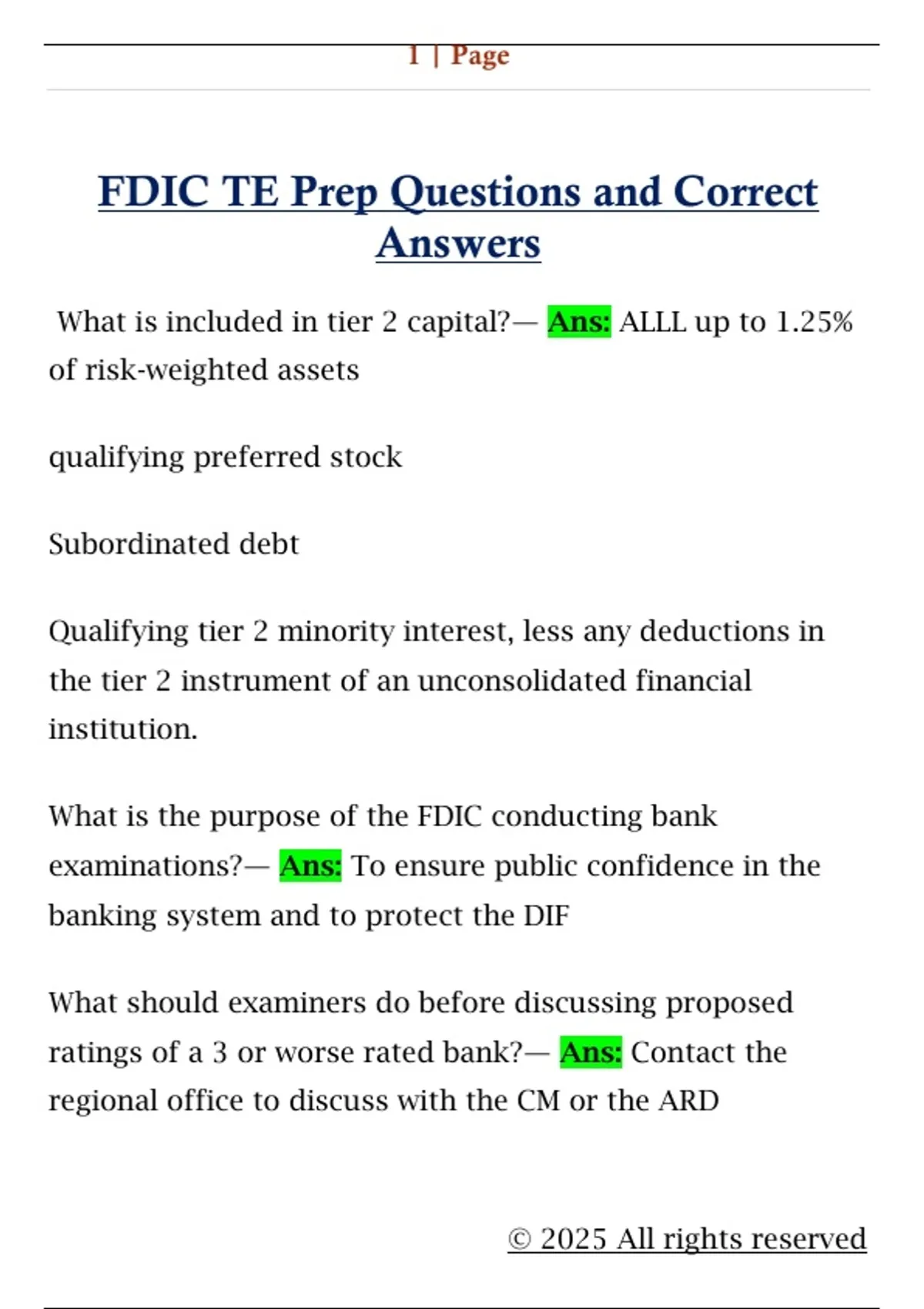 FDIC TE Prep Questions and Correct Answers