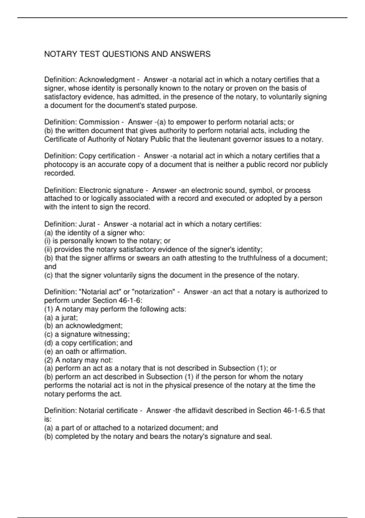 Definition: Acknowledgment - Answer -a notarial act in which a notary certifies that a