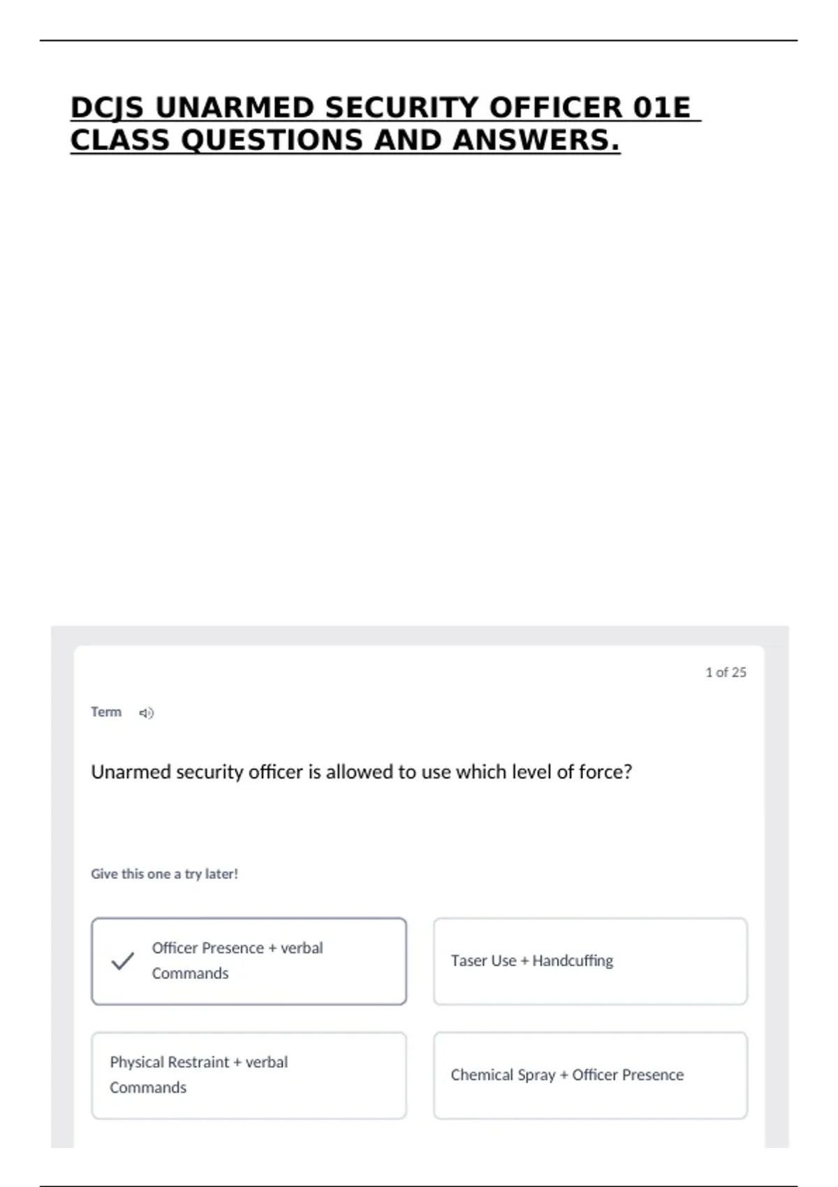 DCJS UNARMED SECURITY OFFICER 01E CLASS QUESTIONS AND ANSWERS.