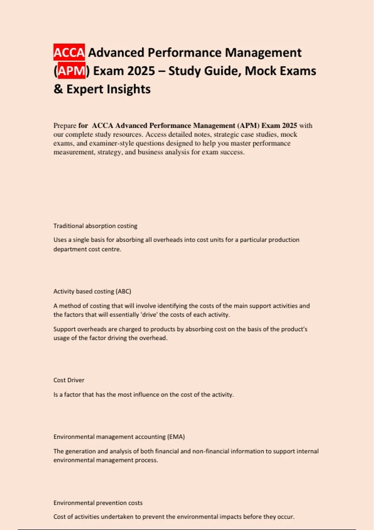 ACCA Advanced Performance Management (APM) Exam 2025 – Study Guide, Mock Exams & Expert Insights Prepare for ACCA Advanced Performance Management (APM) Exam 2025 with our complete study resources. Access detailed notes, strategic case studies, mock exams, and examiner-style questions designed to help you master performance measurement, strategy, and business analysis for exam success