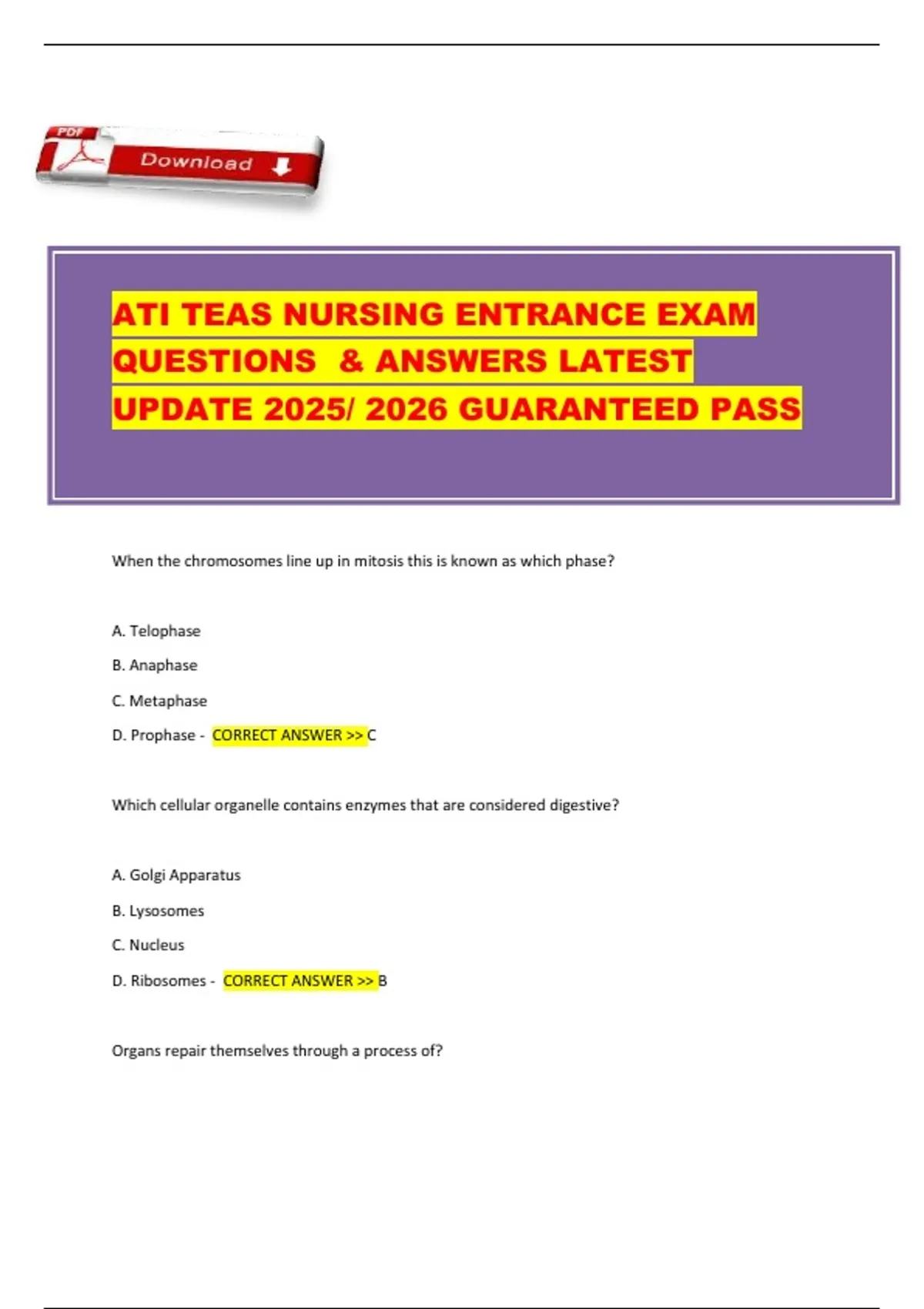 This ATI TEAS Nursing Entrance Exam Review (2025/2026 edition) provides comprehensive practice questions and verified answers across all TEAS subject areas: science, mathematics, English, and reading. It covers topics such as cell biology, anatomy, chemistry, grammar, vocabulary, percentages, and algebra with clear explanations. Ideal for nursing school applicants preparing for the ATI TEAS 7 exam with updated test-style questions and detailed solutions.