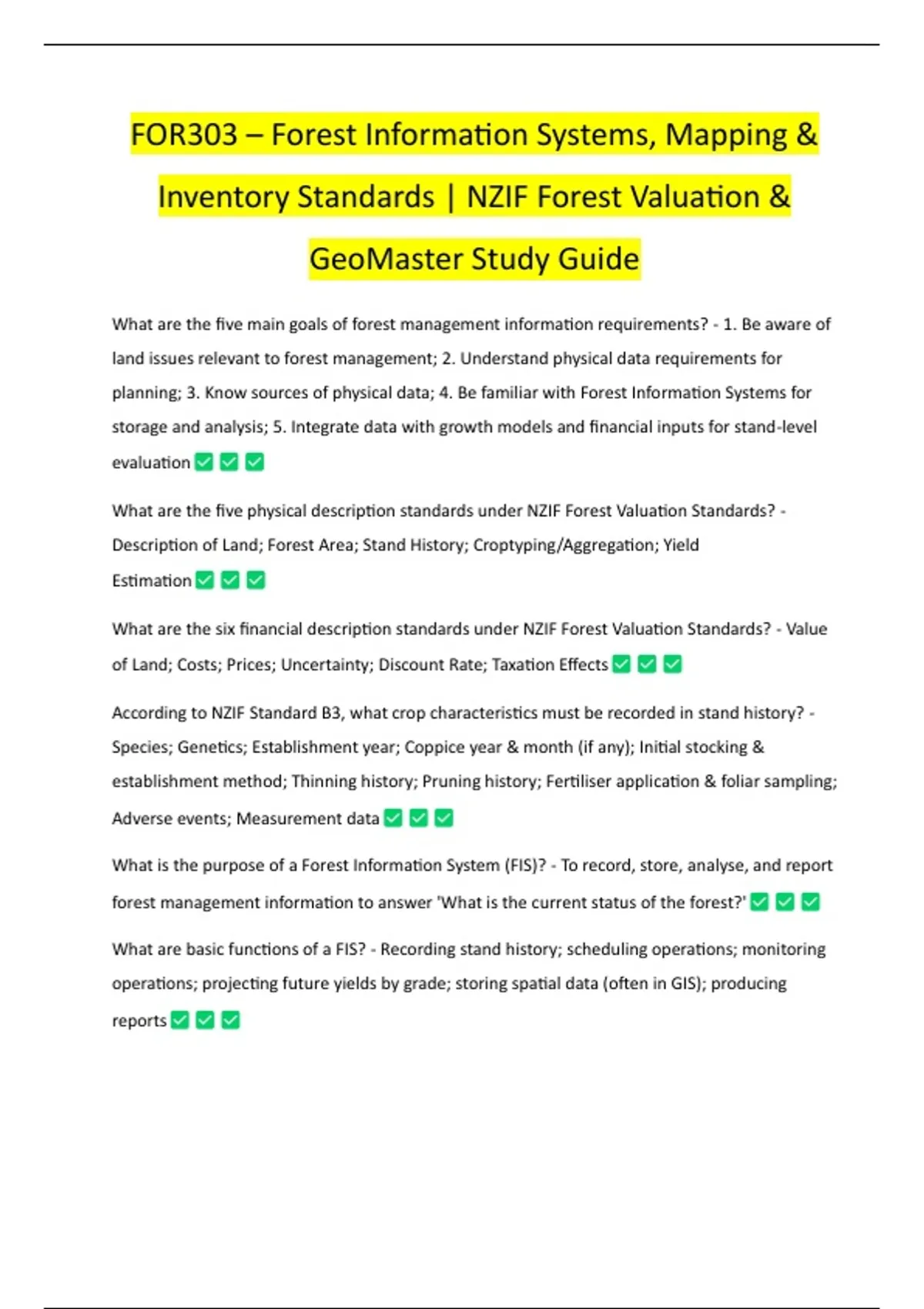 This comprehensive study guide covers Forest Management Information Requirements, NZIF Forest Valuation Standards, Forest Information Systems (FIS), and GeoMaster GIS integration. It includes key definitions, formulas, standards, and best practices for forest area mapping, yield estimation, land description, and valuation. The notes also explain ETS mapping rules, Permanent Sample Plots (PSPs), temporary plots, inventory techniques, and volume/basal area calculations — ideal for forestry valuation and management exam preparation or professional reference.