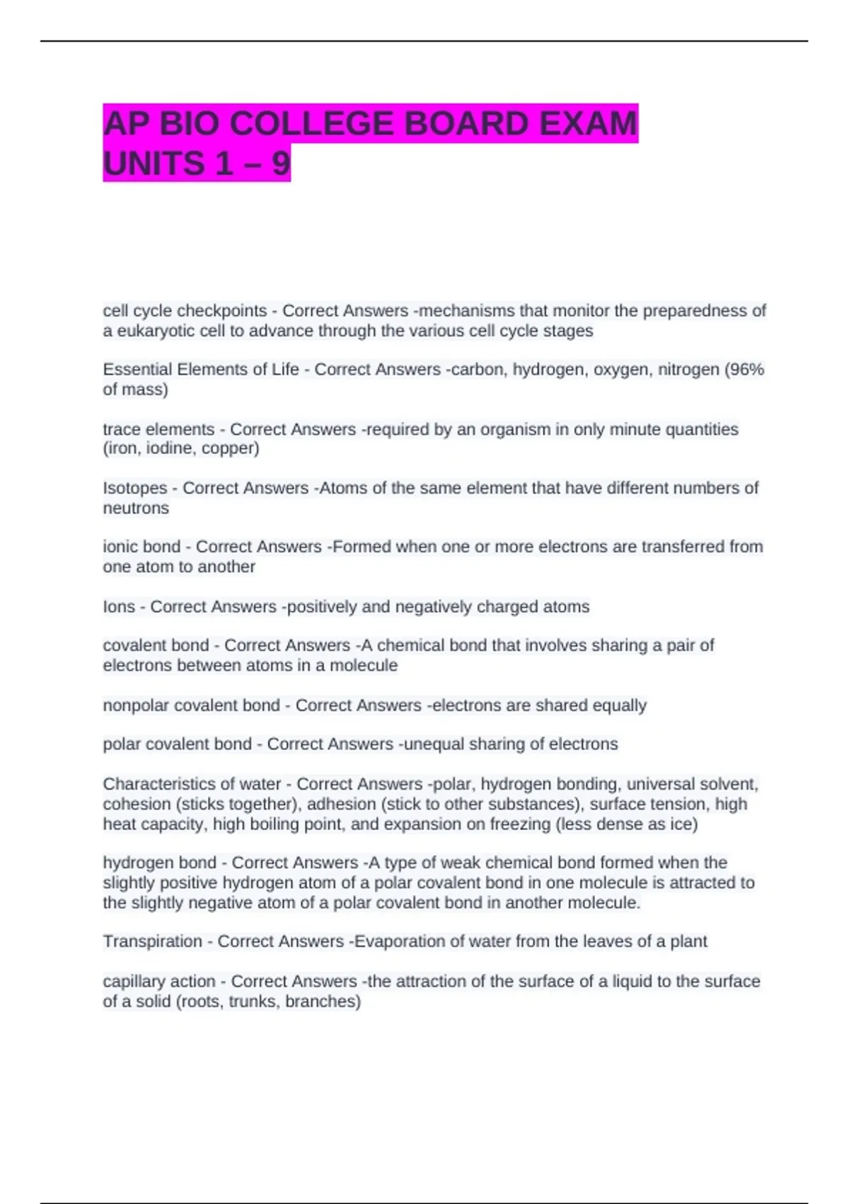 AP BIO COLLEGE BOARD EXAM UNITS 1 – 9 QUESTIONS AND ANSWERS